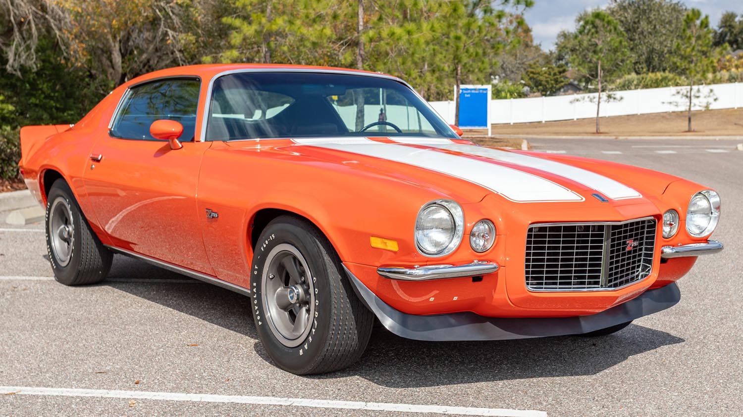 This 1970 Chevrolet Camaro Z28 4-Speed shines in Hugger Orange following a detailed professional restoration. It features a 350ci V8 engine and a four-speed manual transmission. This classic muscle car offers authentic performance and a high-quality finish for any serious collector.