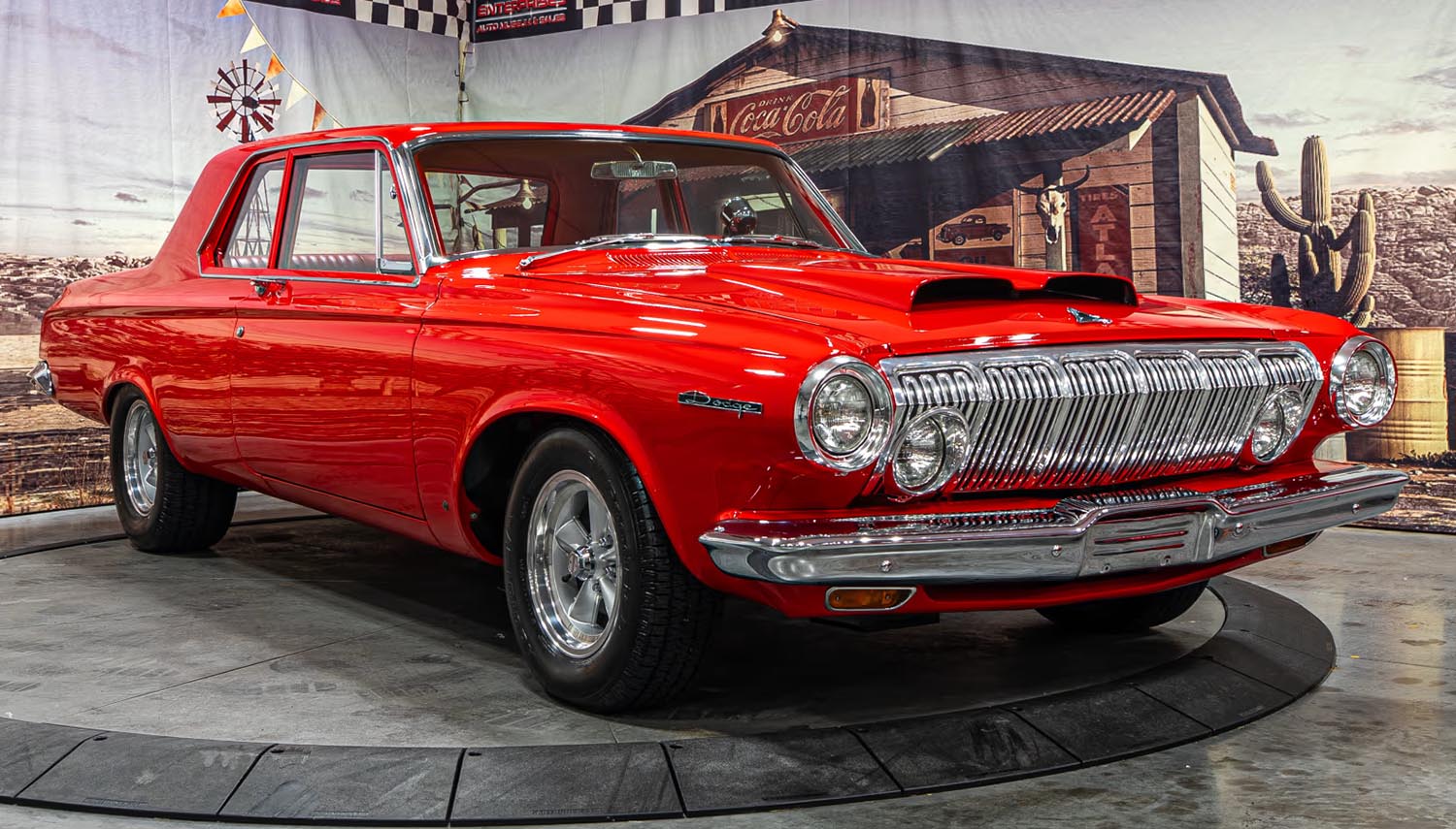 This 1963 Dodge Polara sedan features a powerful 440 CI V-8 with Cross Ram intake and dual Carter AFB carburetors. Power is managed by a TorqueFlite automatic transmission and an 8 3/4 rear end with 3.90 gears. The car boasts QA1 adjustable shocks, front disc brakes, and a custom 3-inch stainless exhaust. The undercarriage is fully rebuilt and detailed.