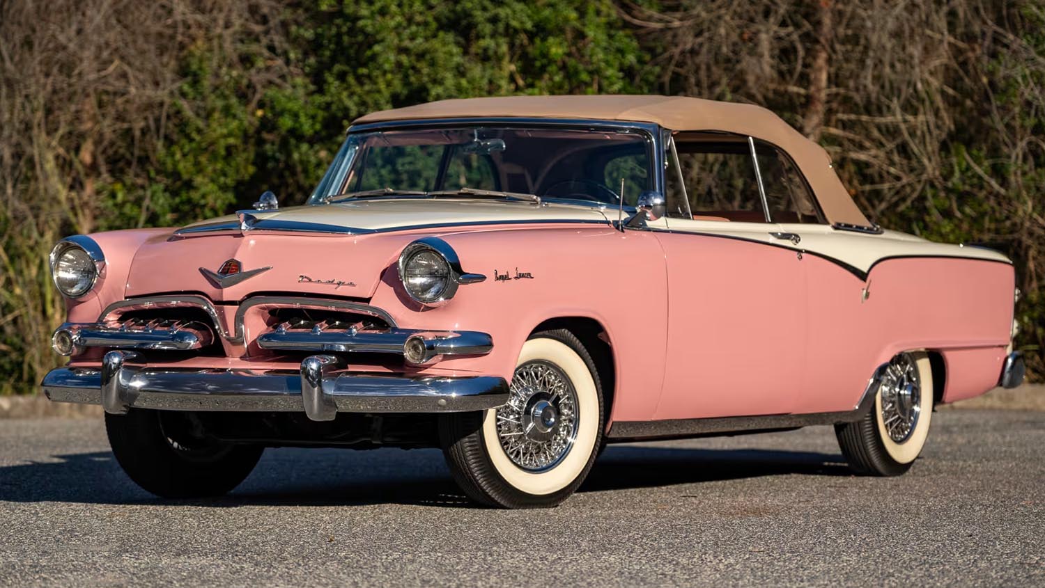 This 1955 Dodge Royal Lancer Convertible features a 270 CI Red Ram Hemi V-8 and a stunning Heather Rose and Sapphire White finish. As one of only 3,302 built, this high-spec flagship represents the pinnacle of 1950s Dodge luxury for Houston 2026.