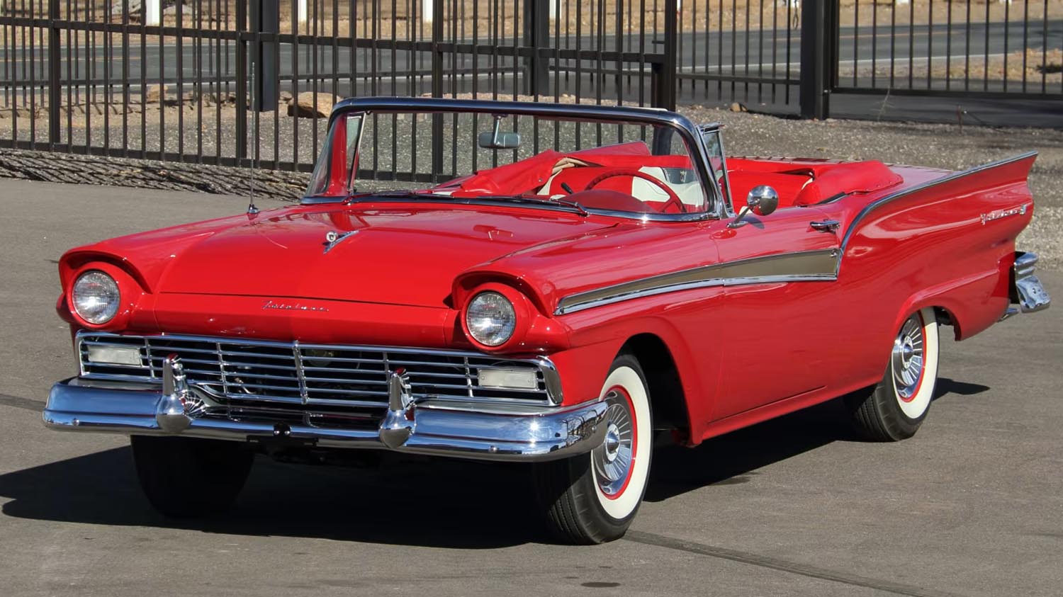 This 1957 Ford Thunderbird Convertible in Red features the powerful 312 CI V-8 and a smooth automatic transmission. Equipped with both hard and soft tops, power steering, and wide whitewall tires, this classic icon is a highlight of the Glendale 2026 auction this March.