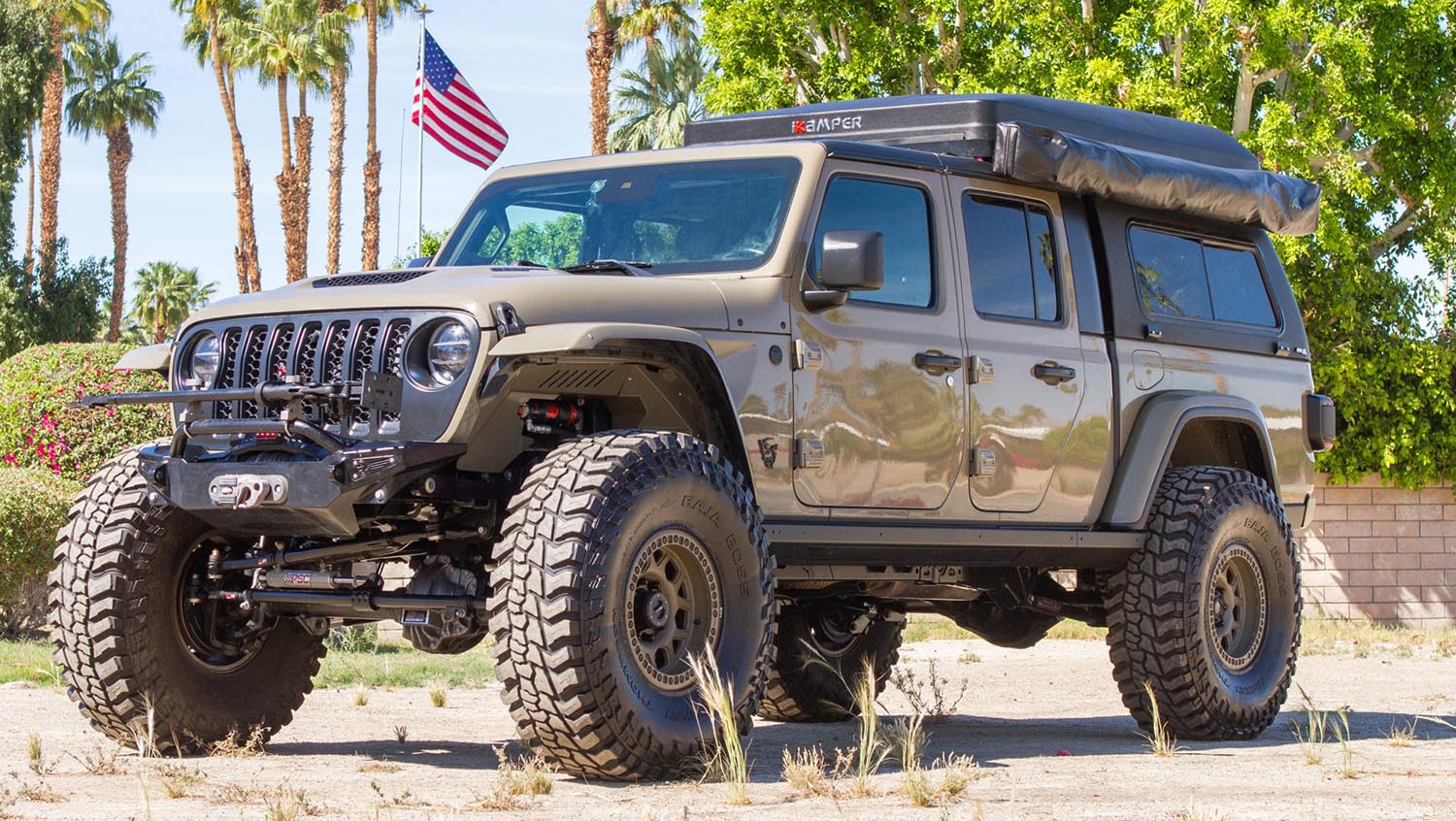 The 2020 Jeep Gladiator Rubicon AMW 840 is a supercharged 840-HP overlanding masterpiece featuring a 6.2L SRT Demon V8 and Trackhawk-spec transmission. Built by America’s Most Wanted 4×4, this Gator Green rig rides on 42-inch tires with a full IKamper rooftop suite.