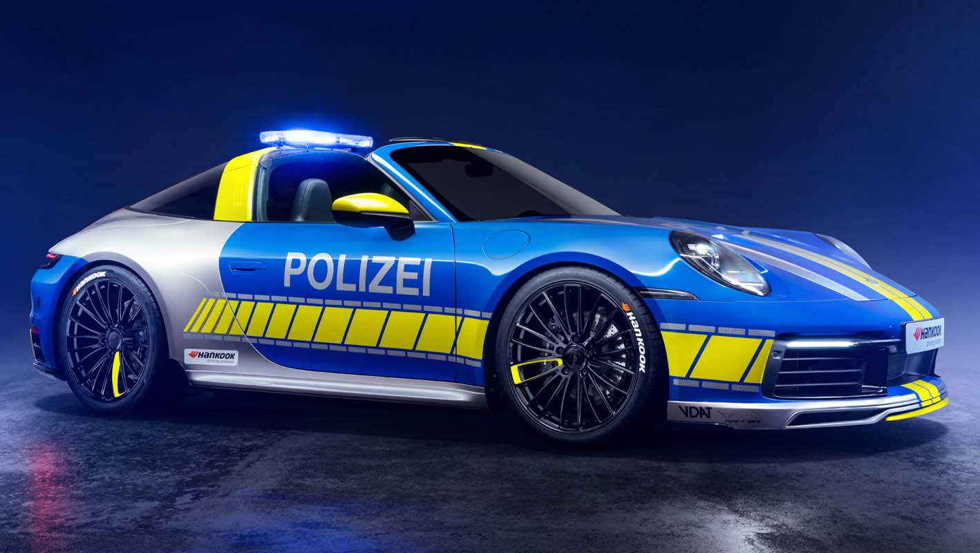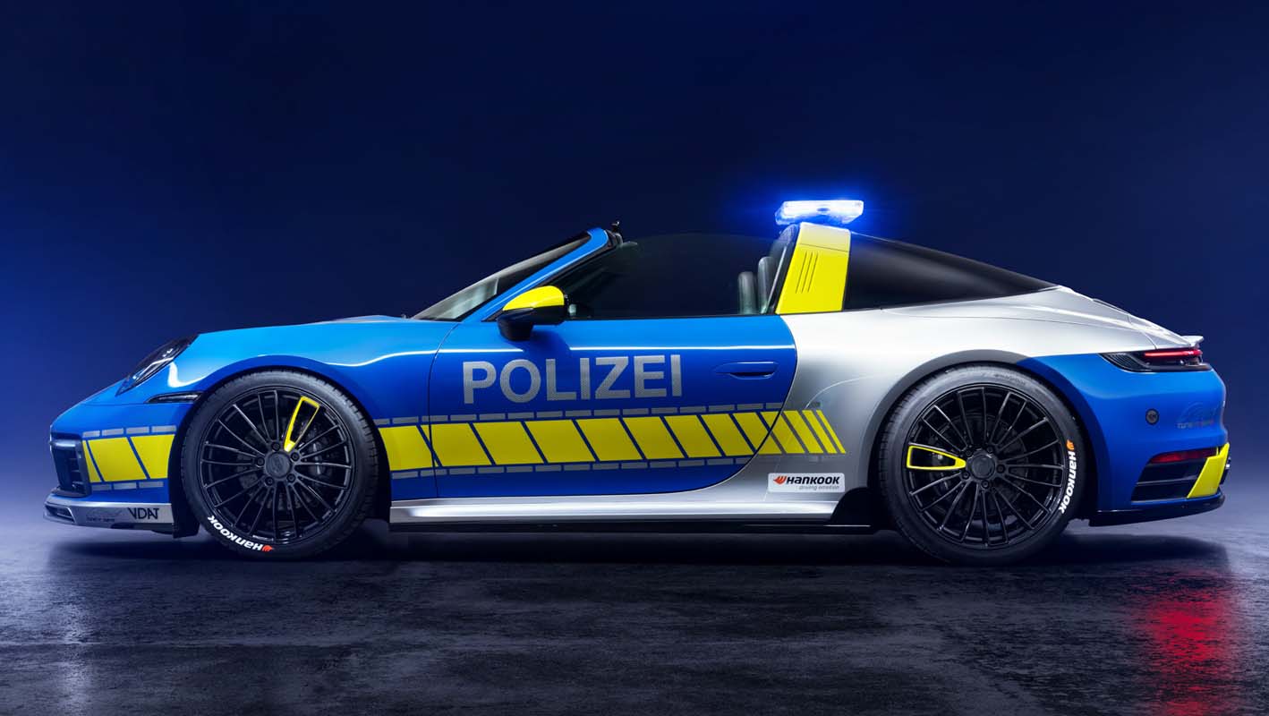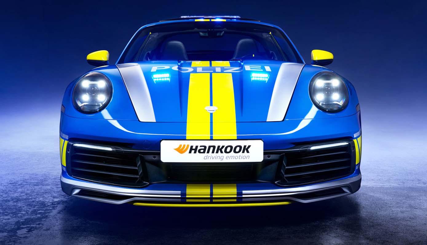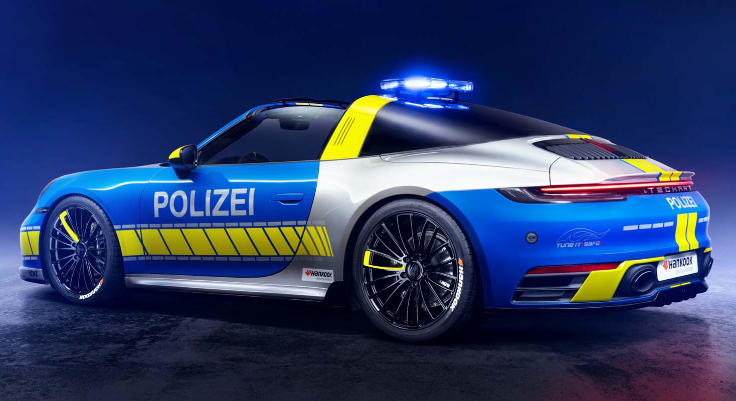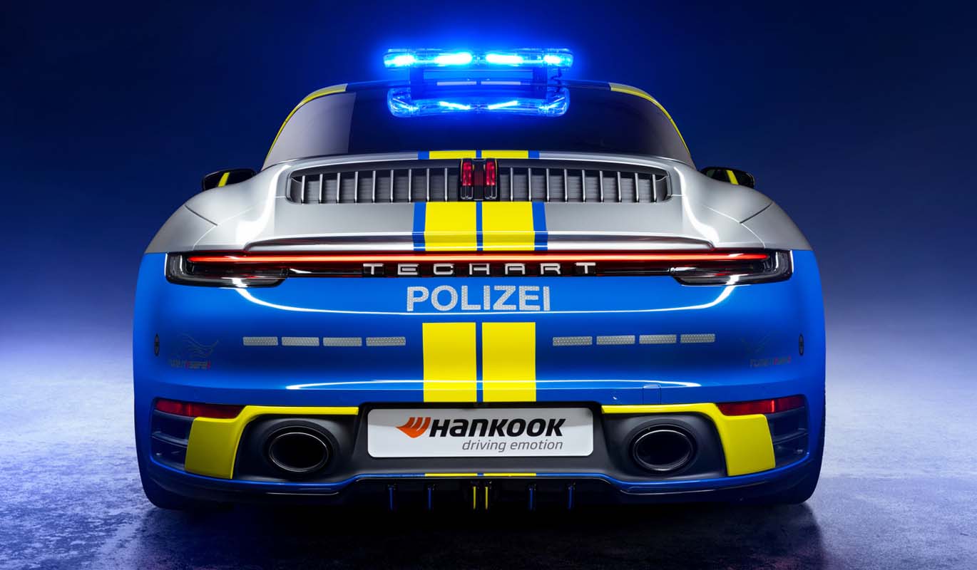 The expressive styling of the TECHART refined Porsche 911 Targa 4 in the police livery is defined by the wind tunnel tested TECHART Aerokit, including TECHART Front Spoiler I, Airframes, Side Skirts, multi-part Rear Diffusor, Aerowings and Rear Spoiler I. The three dimensional TECHART rear lettering as well as the police vehicle lighting and Carbon Aero Front Lid with integrated emergency lighting, visibly set the TECHART Cabriolet from the series model apart.
