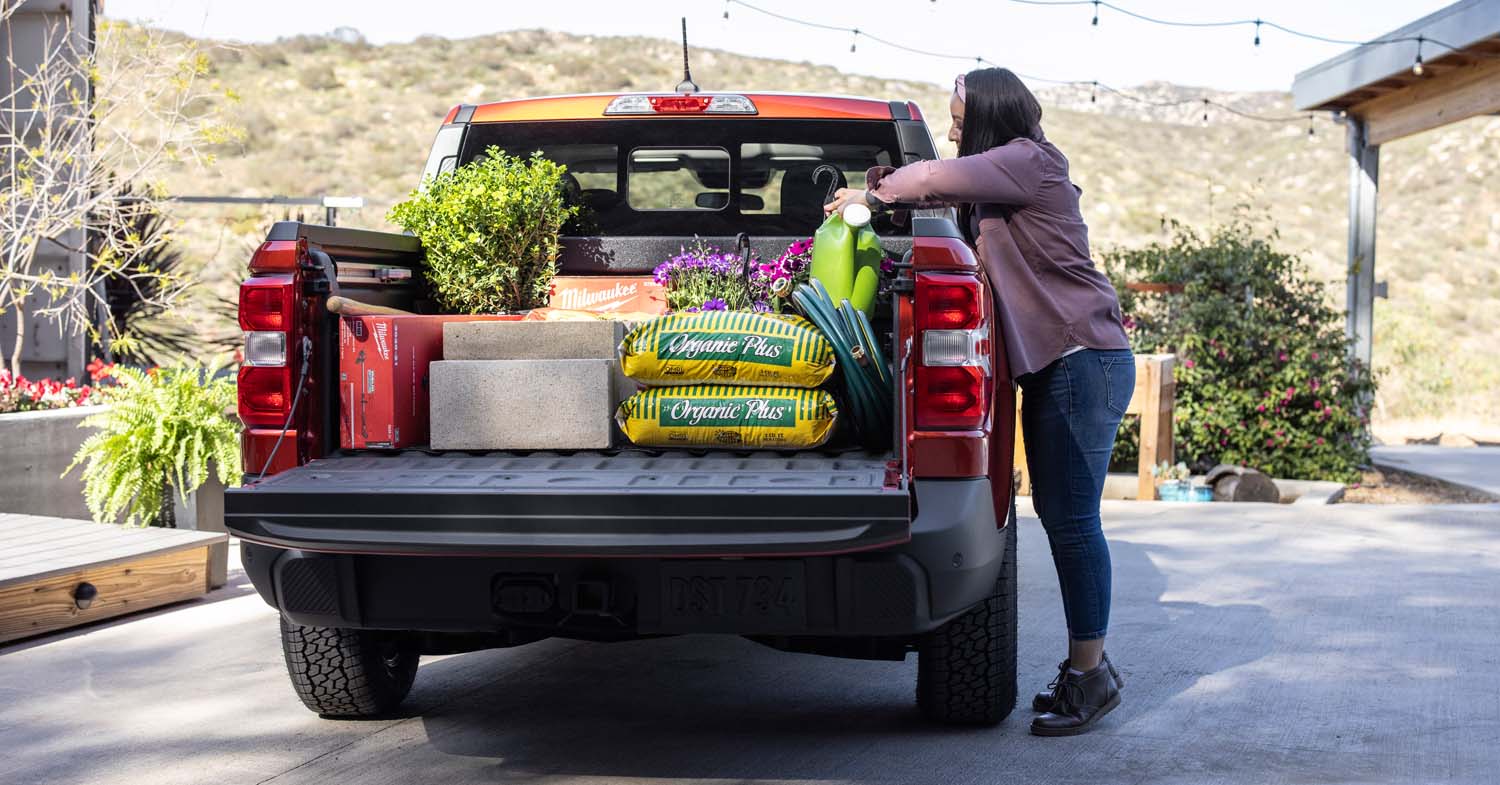 The 4.5-foot bed can carry 1,500 pounds of payload, the equivalent of roughly 37 bags of 40-pound mulch, and has a six-foot floor with the tailgate down. Maverick can carry long and wide stuff too, thanks to its multi-position tailgate. It opens normally, but also has a halfway-open position – just unclip the support cables and hook them onto the latch pins so the tailgate lip and wheelhouses can support up to 18 sheets of 4×8-foot three-quarter-inch plywood without needing to angle the panels. It’s easy. The tailgate features tie-down clamps that double as bottle openers, and is rated to hold 500 pounds of friends hanging out and taking a seat. The bed floor and sides are low, so almost any size adult can reach over and grab items off the floor.