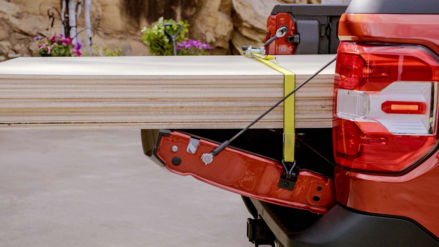 People can create segmented storage, elevated floors, bike and kayak racks and more by sliding 2x4s or 2x6s into slots stamped into the side of the bed. There are two tie-downs, four D-rings and built-in threaded holes in the sides to bolt in new creations.