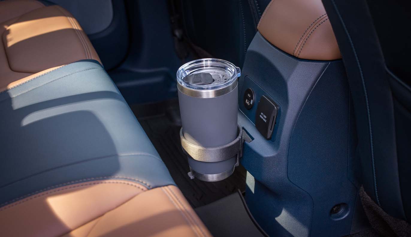 FITS – Ford Integrated Tether System – is a clever multitasking solution for rear seat passengers. There’s a FITS slot at the back of the front console that accommodates different accessories for endless personalization. An available accessory package includes cupholders, a storage or trash bin, cord organizer, double hook for grocery bags and purses, and under-seat storage dividers. More FITS slot creations are in development and Ford is working to publish the slot geometry so people can 3D-print DIY solutions to further fit their lifestyle. Those accessories can be stored in multiple slots under the rear seats, which could also be used for novel applications on their own.
