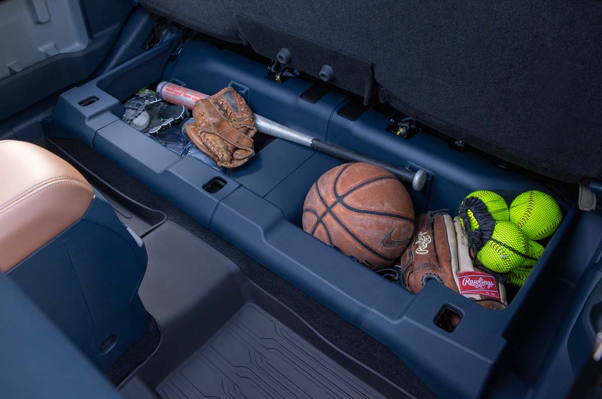 What’s key, he said, was understanding how people actually use the stuff they bring in, rather than just expecting them to find places to stash it. Door armrests have a split design to allow a one-liter water bottle to sit upright in a bin rather than rolling around on the seats, while door pockets are huge and have lots of vertical clearance to store a tablet or notebooks. There’s a spacious storage bin under the rear seats that fits a fully inflated volleyball, laptop bags, roller blades, tools and other gear.