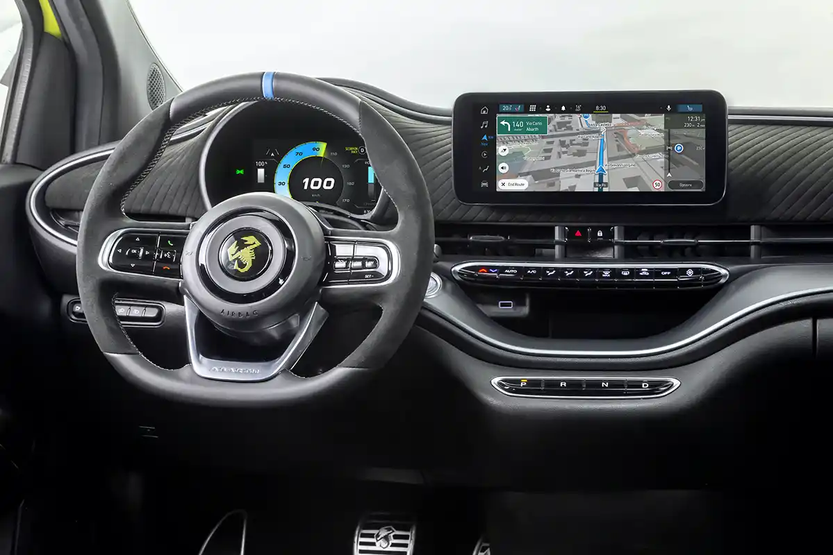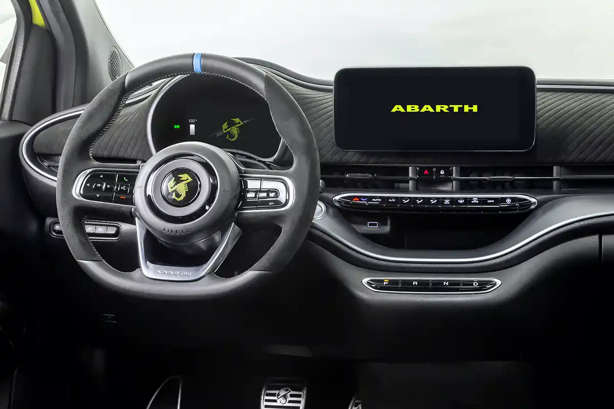 The New Abarth 500e Scorpionissima is equipped as standard with the Uconnect™ Radio Touchscreen 10.25″ with an integrated navigation system and the brand – new Performance Pages – a high-tech display with new exciting Abarth graphics.