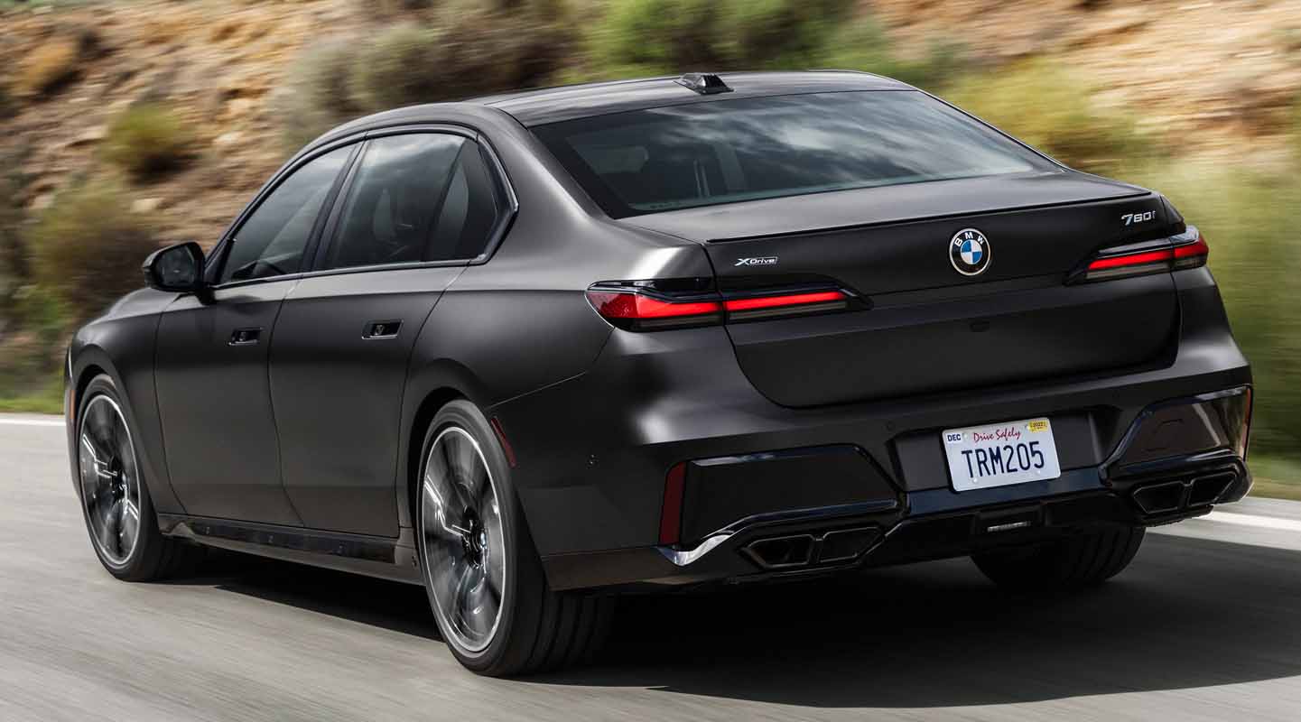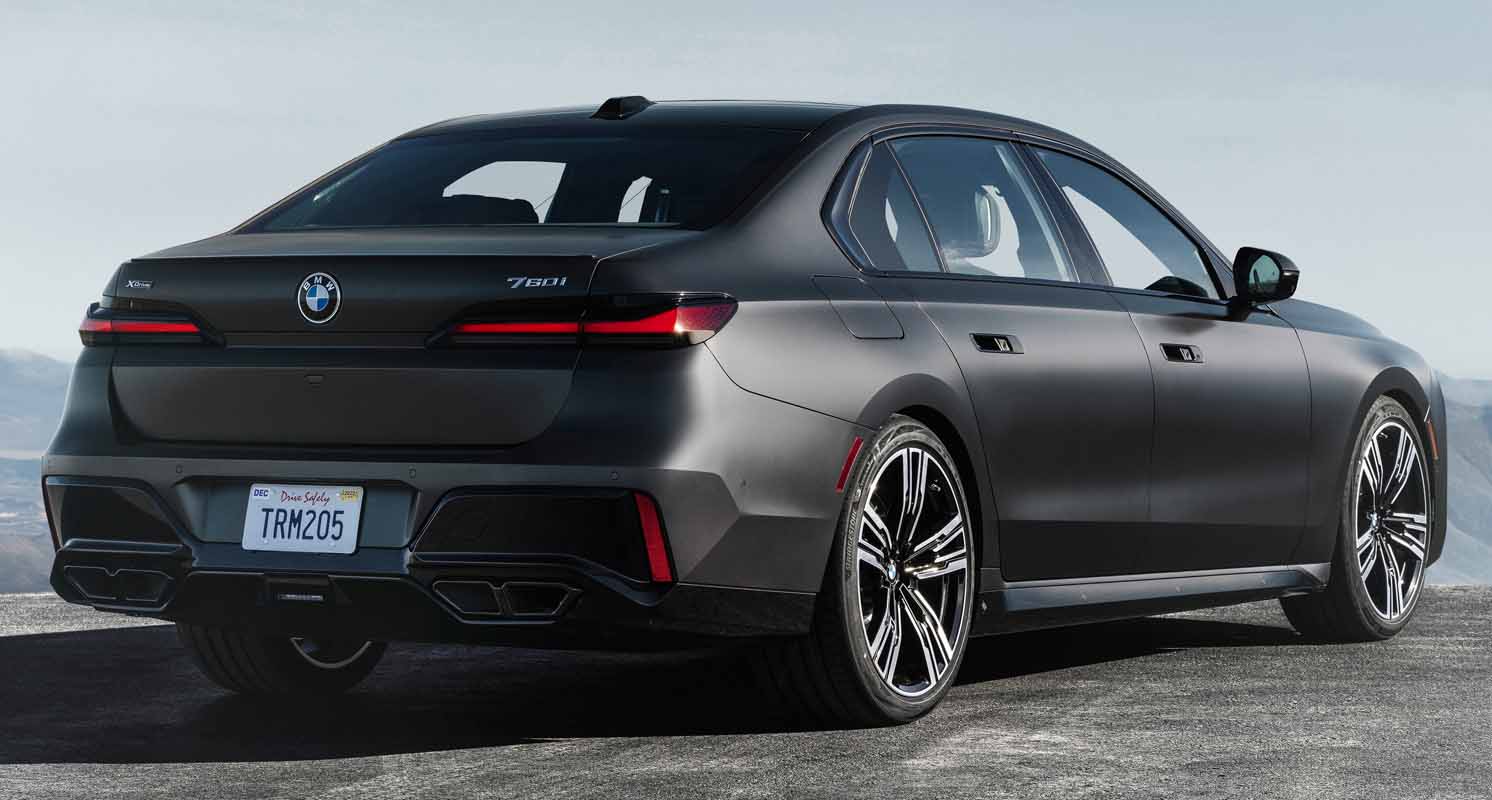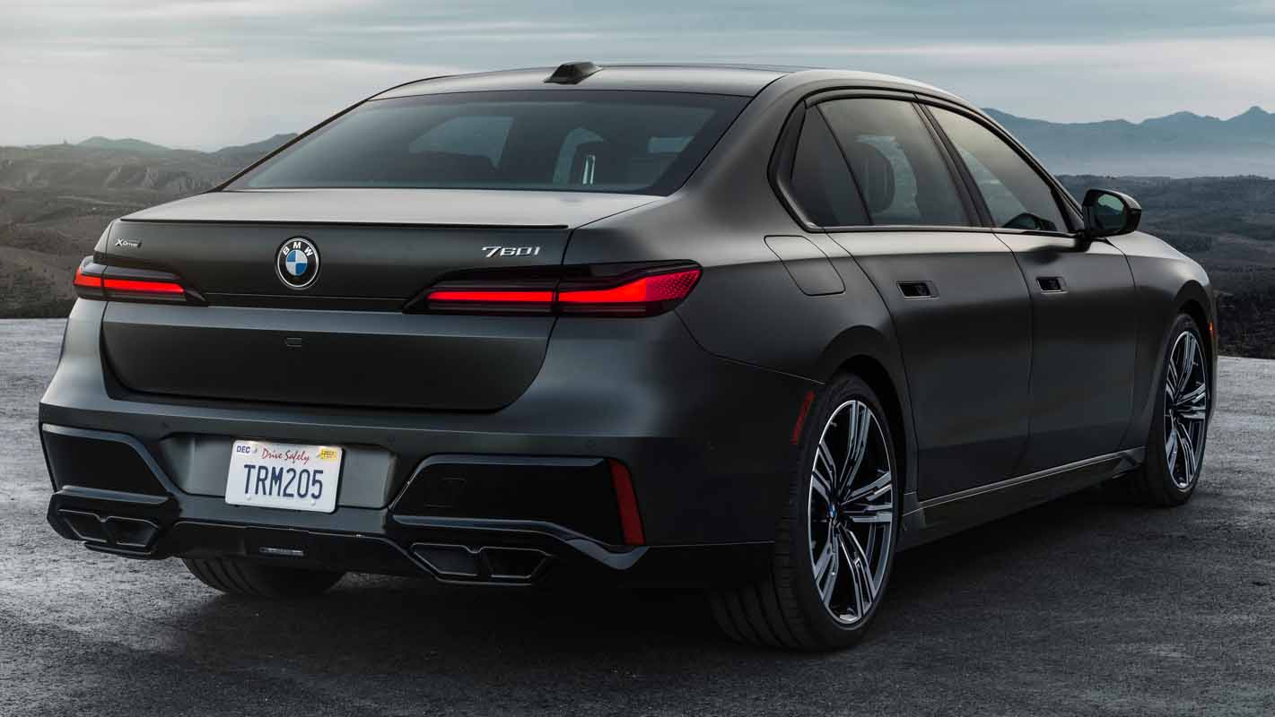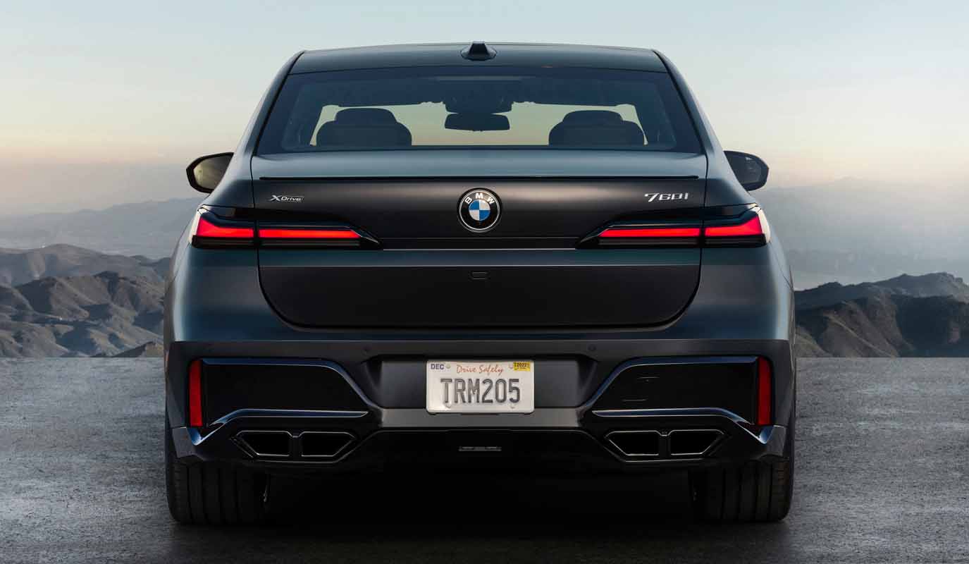 The new BMW 7 Series model range worldwide will expand to include two BMW M models equipped with electrified drive systems. The new BMW M760e xDrive (fuel consumption combined: 1.2 – 1.1 l/100 km [235.4 – 256.8 mpg imp]; electric power consumption combined: 26.9 – 25.8 kWh/100 km; CO2 emissions: 28 – 25 g/km in the WLTP cycle; figures in NEDC cycle: –) has output of 420 kW/571 hp and torque of 800 Nm (590 lb-ft) and will debut as early as spring 2023. Its electric motor generates a temporary boost worth an extra 30 kW/40 hp when particularly invigorating acceleration is the order of the day. An M-specific design for the exterior and interior, including an exhaust system featuring the distinctive twin tailpipes with unique geometry, underscores the performance characteristics of the BMW M model with plug-in hybrid technology.
