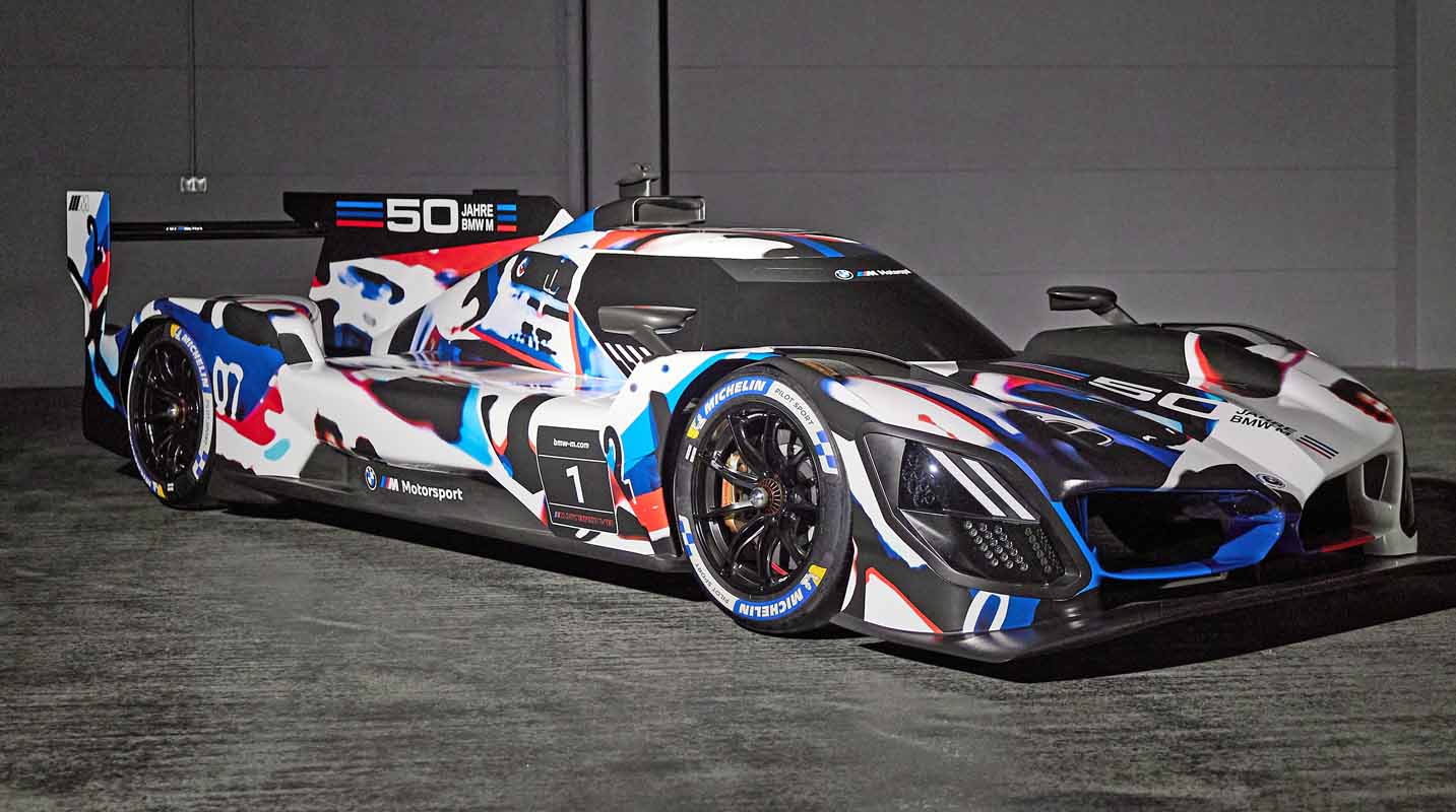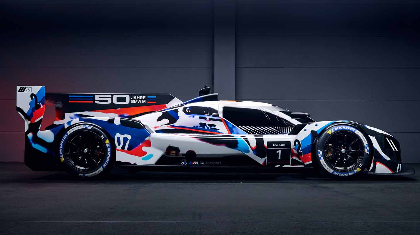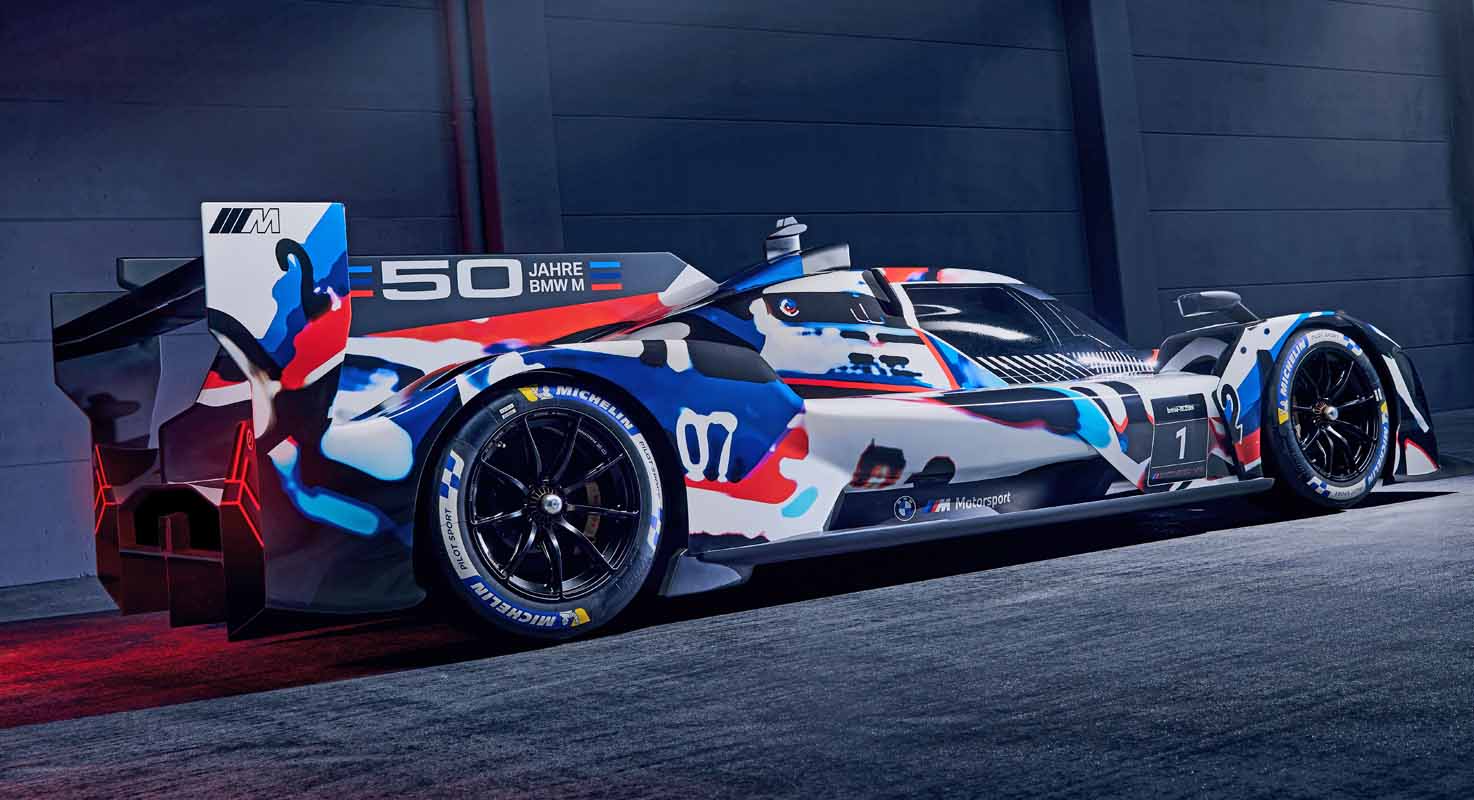 “My team’s job was to make the BMW M Hybrid V8 look like a BMW, and embrace every opportunity to make it also perform like one on the race track,” said BMW Group Designworks Global Automotive Director Michael Scully. “The design is rooted in BMW’s DNA of purposeful, efficient performance, and the exterior’s bold, determined character invokes BMW’s frontiersmanship of turbo power, now united with an optimised hybrid electric powertrain. The camouflage livery celebrates the 50 Years of M by commemorating the great cars of BMW’s storied history in IMSA racing while uniquely cloaking the BMW M Hybrid V8’s future-facing exterior geometry and technologies during the critical on-track development phase of the project. If you look closely you’ll discover multiple winners of the Daytona 24 Hours, as well as the very first purpose-built IMSA GTP car from 1981, the BMW M1/C. We’ll follow-up this camouflage with a works livery that exemplifies the dynamism and excitement of hybrid electric-powered competition.”