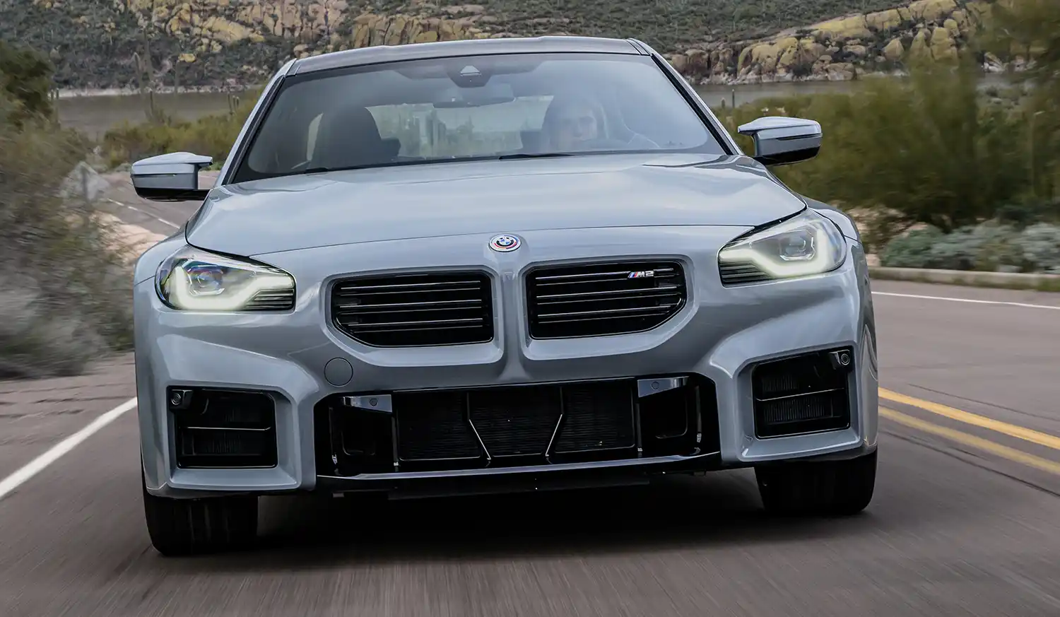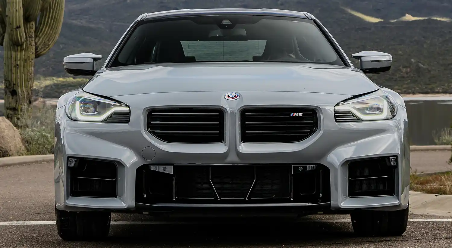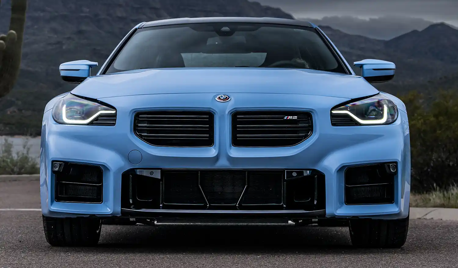 The front end of the new BMW M2 is headlined by its large, horizontal and frameless BMW kidney grille. The elements of the M-typical threesection lower air intake have almost rectangular contours and optimise cooling of the powertrain components and brakes. The boldly contoured headlight units are positioned to the outer edges of the front end. Inspired by the legendary BMW 02 models, they each have a single circular headlight using full-LED technology for both low beam and high beam. The dark background of the lights clearly showcases the advanced technology at work. The daytime driving lights take the form of U-shaped light guides at the lower edge of the headlights, in which the turn indicators are also integrated. Available as options are Adaptive LED Headlights with BMW Selective Beam non-dazzling High-beam Assistant and M lights Shadow Line with dark inlays.