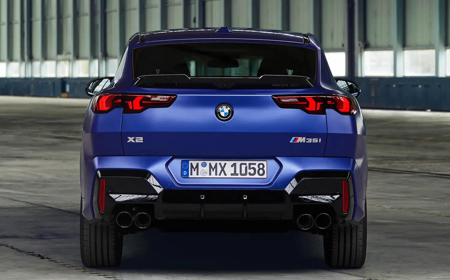 M-specific design features such as the two pairs of exhaust tailpipes integrated into the rear apron give the BMW X2 M35i xDrive a particularly dynamic aura. An M Sport package is available for all other model variants, including the new BMW iX2, and likewise brings aerodynamically optimised exterior details. Also on the options list is the M Sport package Pro, which adds extended M High-gloss Shadowline exterior trim, M lights Shadowline, an M rear spoiler and an M Sport braking system with red-painted callipers, among other features.