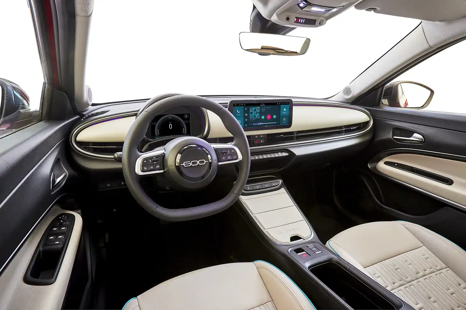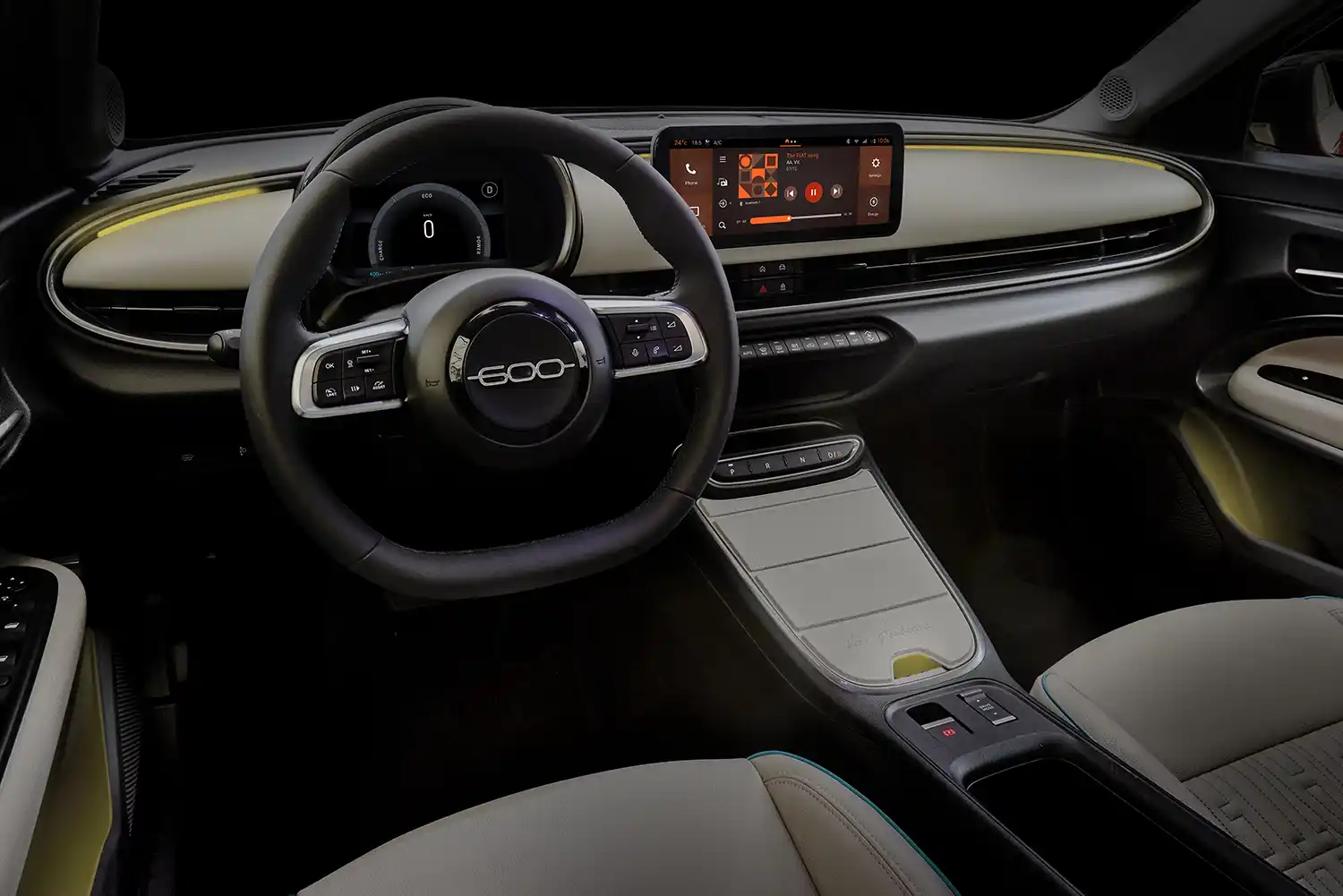 Inside, the New Fiat 600e perfectly embodies the Italian Dolce Vita and the most pop soul of the Brand, thanks to several features specifically designed to offer the best pampering experience. Above all, the New Fiat 600e is the first compact to offer the color therapy. Customers can select up to 8 different colors for both the ambient light and the radio ambience, with a ton sur ton default combination and a total of 64 different matching selectable, for an unprecedent color surround experience. For a complete Italian spa time, the driver seat is equipped with seat adjustment power and a back-massage function, to relax after a long trip or a busy day at work. The New Fiat 600e also offers Ivory synthetic leather seats with FIAT monogram with turquoise accents and 3 stage heating for the maximum comfort and premiumness.