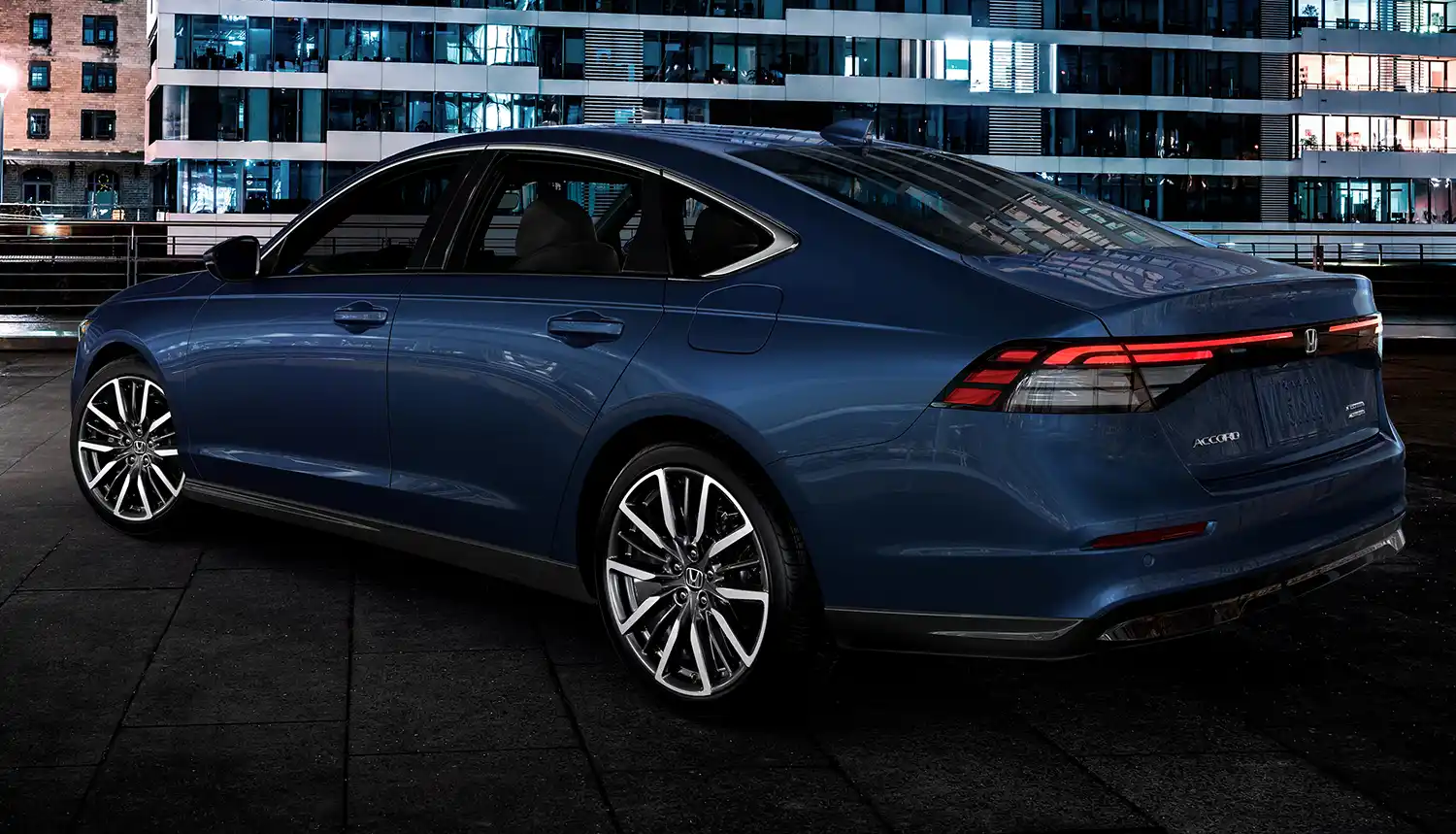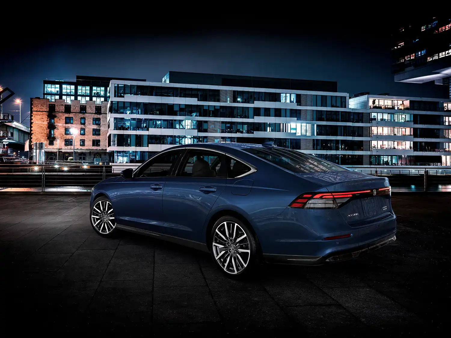 LX, EX and EX-L trims feature a black grille mesh, body-color side mirrors and standard 17-inch alloy wheels. Sport, Sport-L get even sportier styling with black side mirrors, a black rear spoiler and black 19-inch alloy wheels, while Sport-L models add a unique black rear diffuser. The top-level Touring features unique gloss-black 19-inch alloy wheels along with silver and black exterior trim for a sharp, high-contrast look. All 2023 Accords feature a 0.4-inch wider rear track for a broader stance and improved stability.
