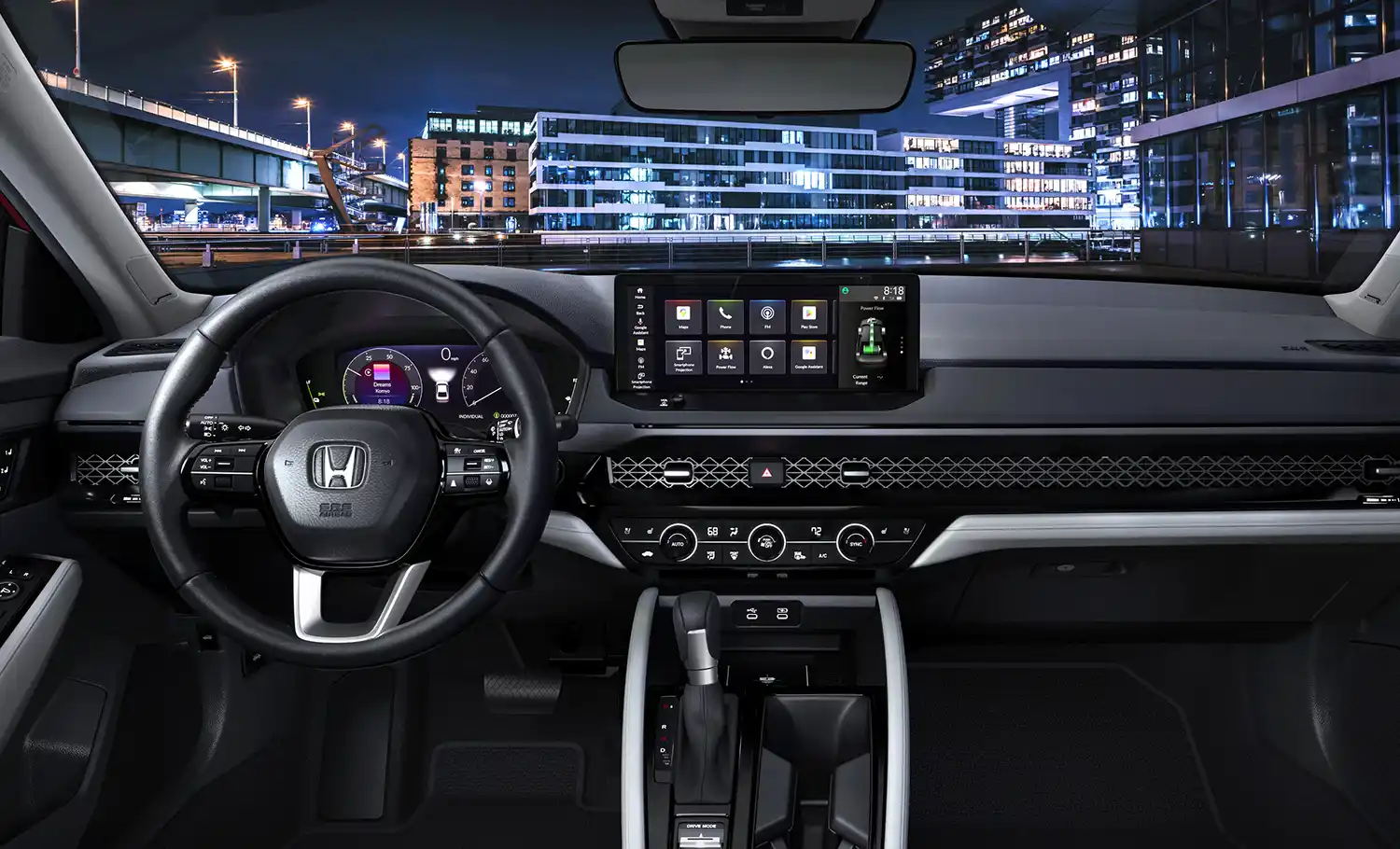 Accord hybrid models (Sport, EX-L, Sport-L, Touring) come standard with Honda’s largest ever touchscreen, a 12.3-inch unit with a physical volume knob, wireless Apple CarPlay® and Android Auto™ compatibility and a simplified navigation structure with fewer menus. A 1-inch finger rest at the bottom of the touchscreen makes it easier to use by providing a stable surface to rest your hand, and Qi-compatible 15W wireless smartphone charging is available (Touring).