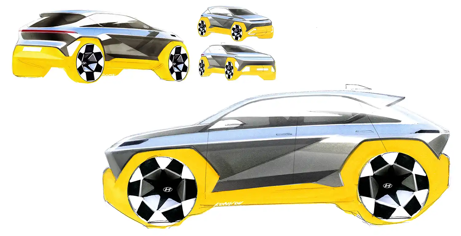 There are several styling variations between the powertrain variants. The EV gets pixel graphic details on the intake grille and rear bumper, a pixel-inspired 19-inch alloy wheel design, black embracing line and optional black side mirrors and roof. The ICE and HEV share a bold and rugged bumper and skid plate design, and black wheel arch cladding. The N Line boasts optional black side mirrors and roof, wing-type spoiler, more aggressive front and rear designs with wing-shaped bumper to emphasize a lower stance, distinctive 19-inch alloy wheels, twin muffler and silver side skirt.