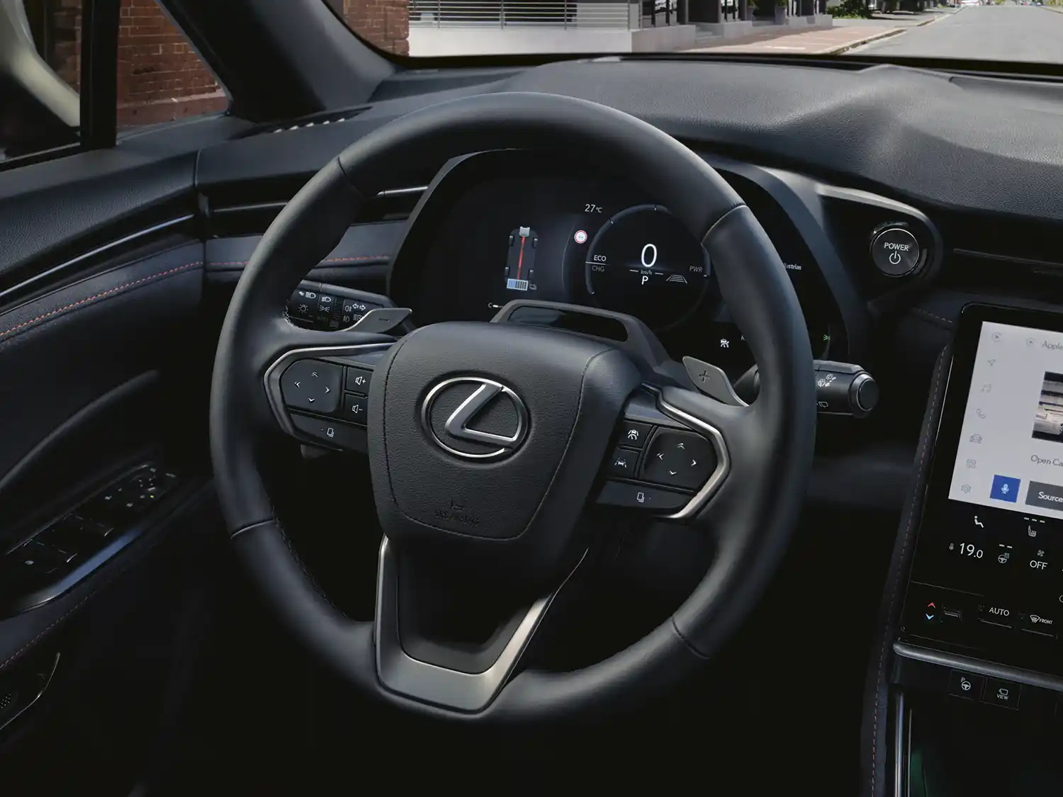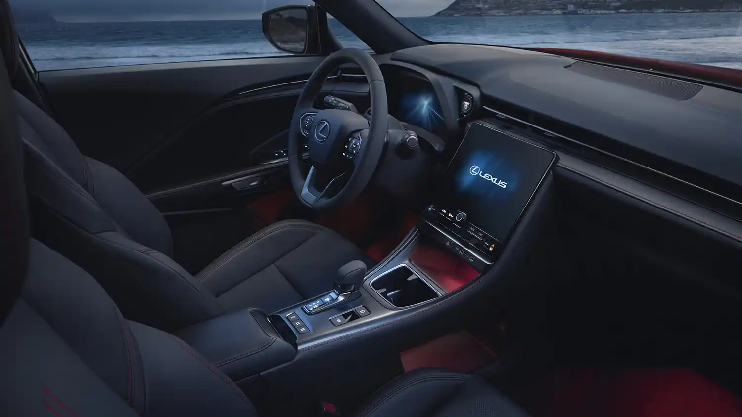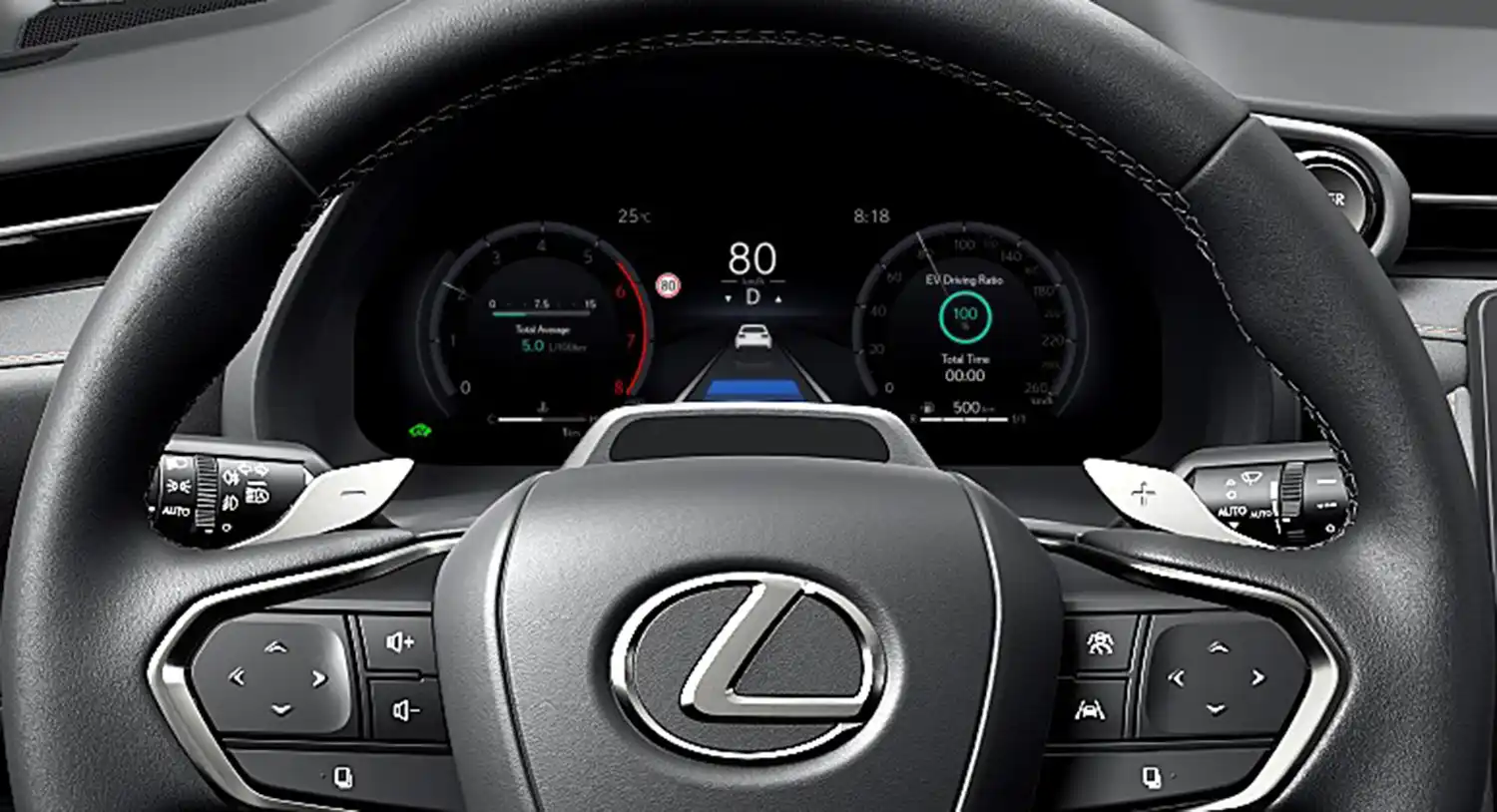 The driver’s cockpit is an interpretation of Lexus’ Tazuna concept, first introduced on the NX mid-size SUV. This positions principal controls and information sources immediately around the driver, so their operation only requires minimal movements of hand or eye. This helps keep the driver focused on the task of driving, with least distraction. The position and angle of the steering wheel were precisely calculated to give the driver a rewarding sense of control.