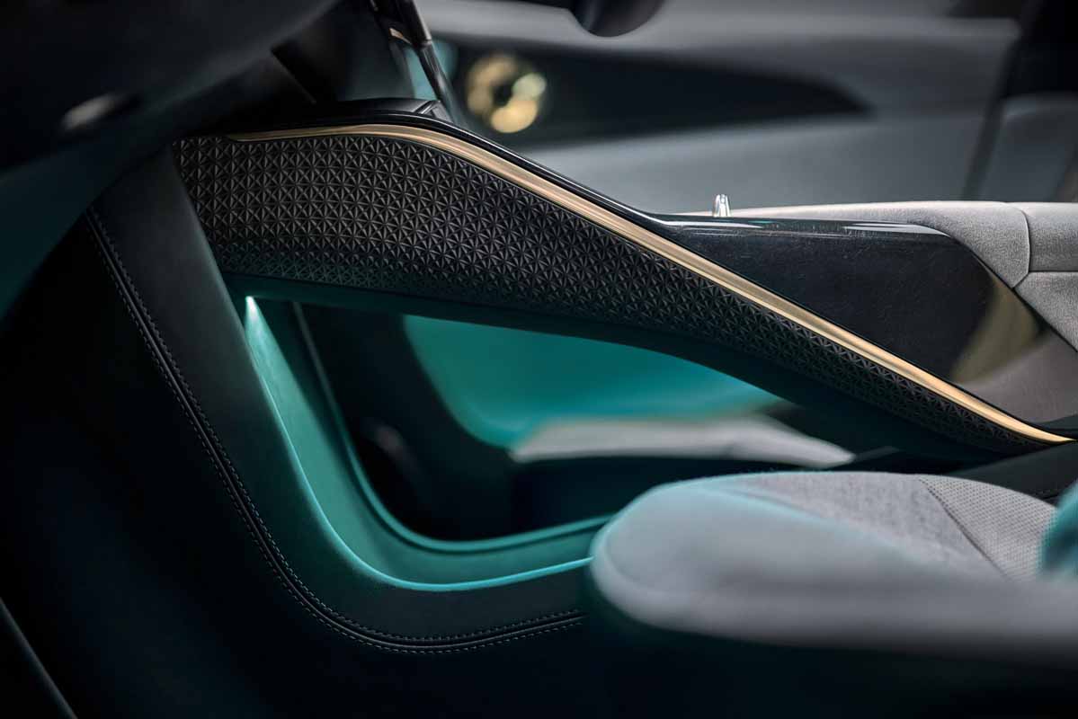 Sustainability has been a core focus of the design team, which has worked with leading supplier Kvadrat on material choices. The interior uses premium feel and highly durable man-made microfibres on the primary touchpoints, and an advanced wool-blend fabric on the seats. It is 50% lighter than traditional leather, allowing for further weight savings. The hard materials are carbon fibre, though rather than use the traditional ‘weave’ most often associated with automotive design, Lotus has recycled the fibres trimmed from the edge of the weave. These have been reconstructed into a new matting, then compressed in a resin to create the car’s premium marble-like finish.
