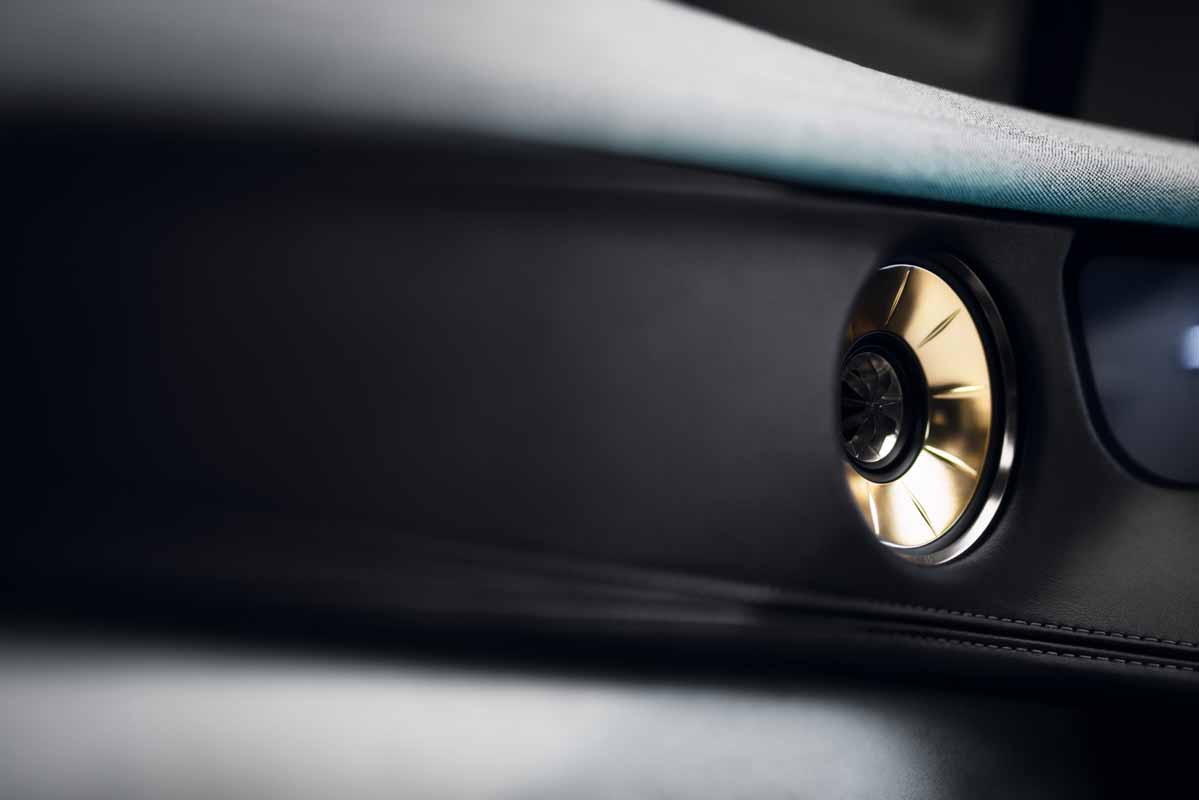 Below the instrument panel a blade of light runs across the cabin, sitting in a ribbed channel that widens at each end to create the air vents. While it appears to be floating, the light is more than decorative and forms part of the human machine interface (HMI). It changes colour to communicate with occupants, for example, if a phone call is received, if the cabin temperature is changed, or to reflect the vehicle’s battery charge status.