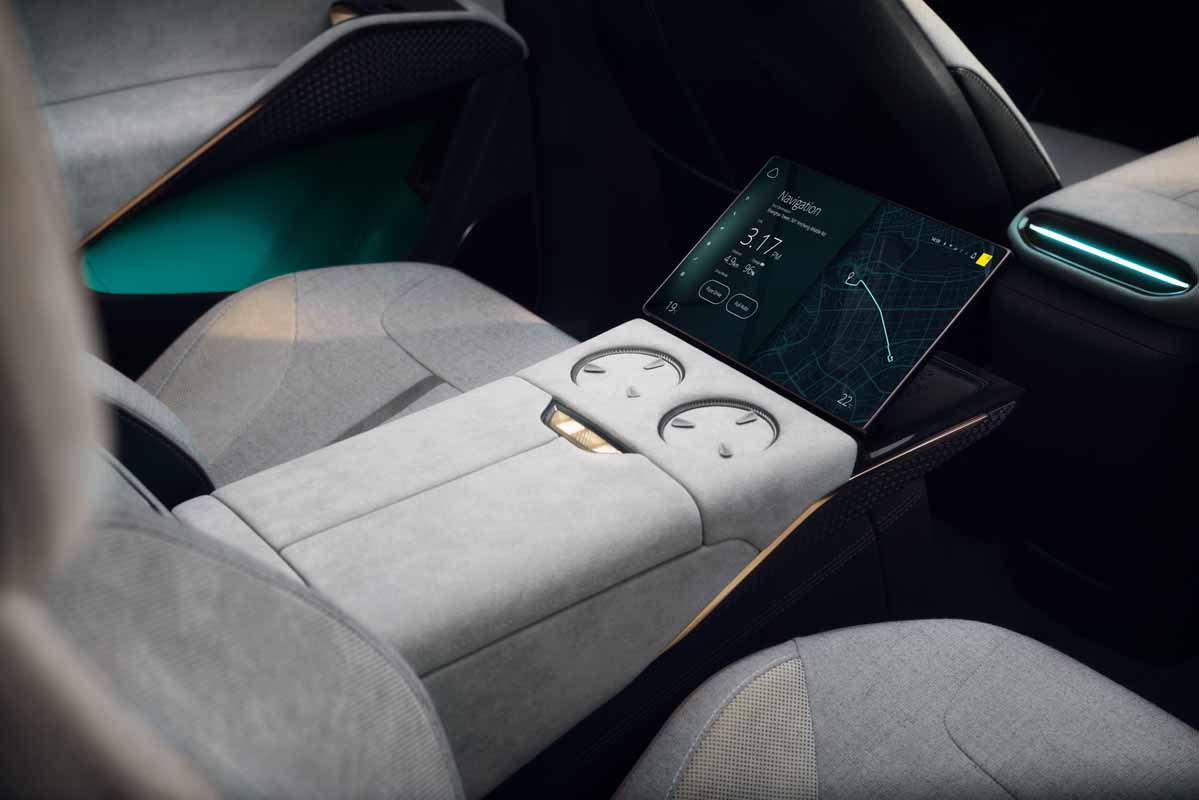 The smart design is continued in the rear of the car, with space in the doors and between the two chairs. There is a central draw at knee and the armrest splits behind the two cupholders. It ends in an angled nine-inch touch-screen for infotainment, with a wireless charging tray beneath.