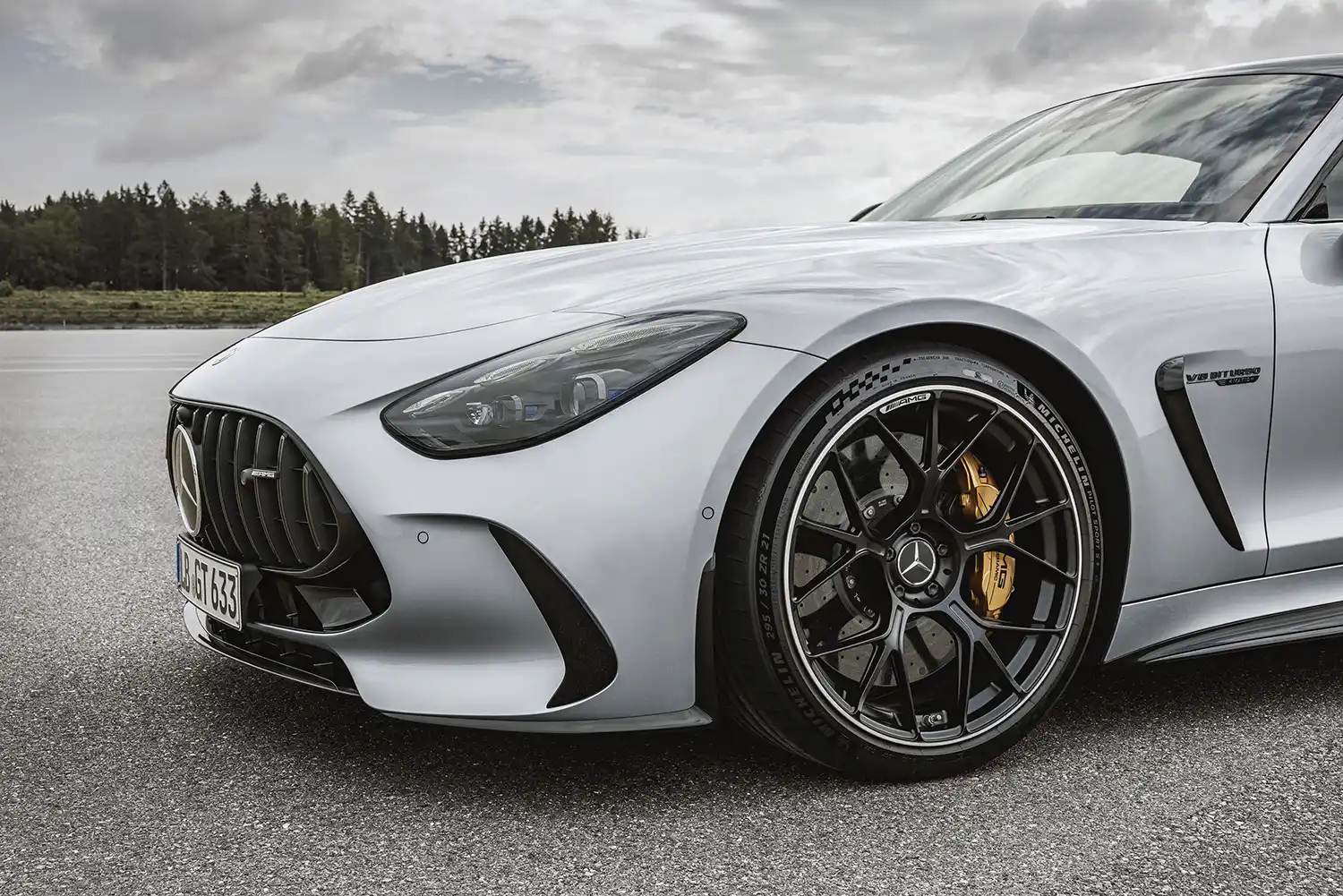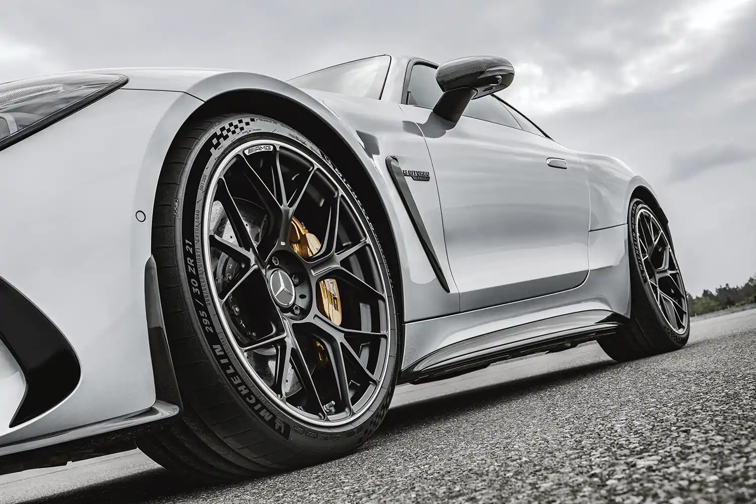 The new AMG GT Coupé offers a multi-link front axle with five links arranged entirely within the wheel rim. The wheel control and wheel suspension elements, which are independent of one another, enable high lateral acceleration with minimal drive influences on the steering system. A five-link space construction also guides the wheels on the rear axle.