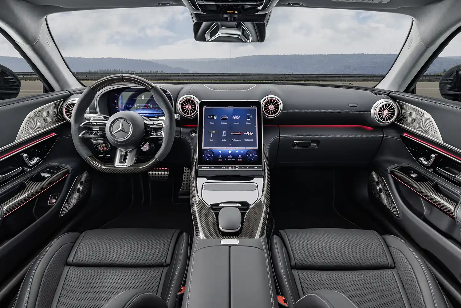 The centre console flows into the lower section of the instrument panel. The functional and optical centre is the 11.9‑inch multimedia touchscreen. The portrait format offers clear advantages, especially for navigation, as well as more ergonomic freedom. Brilliant views on the LCD screens make it easier to control the vehicle and comfort functions. The driver and central display are coordinated holistically. The appearance of the instrument cluster can be personalised with individually selectable main views. The MBUX (Mercedes‑Benz User Experience) infotainment system is intuitive to use and capable of learning. It offers extensive AMG-specific content in five display styles. Exclusive menu items such as “AMG Performance” or “AMG TRACK PACE” underline the sporty character.
