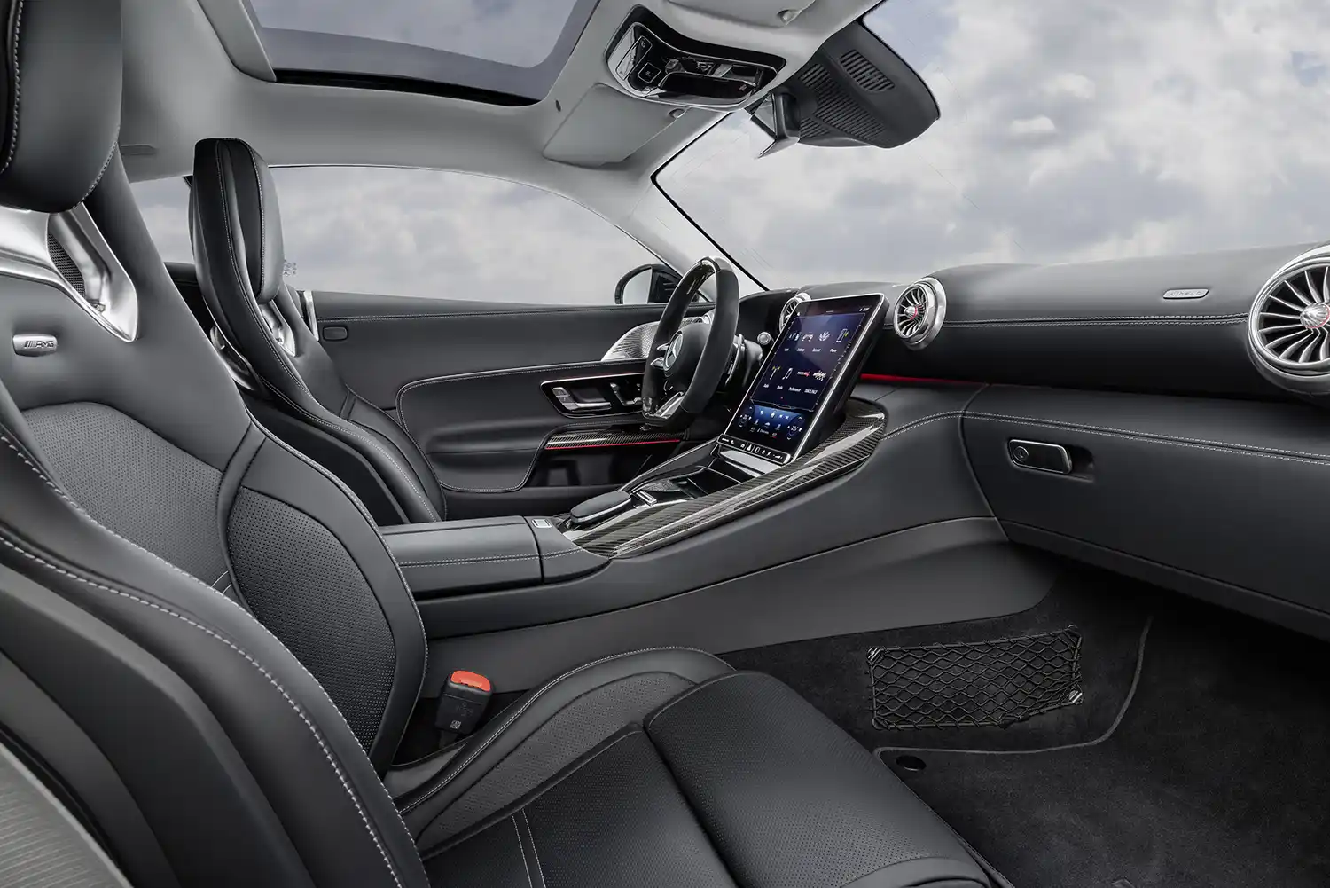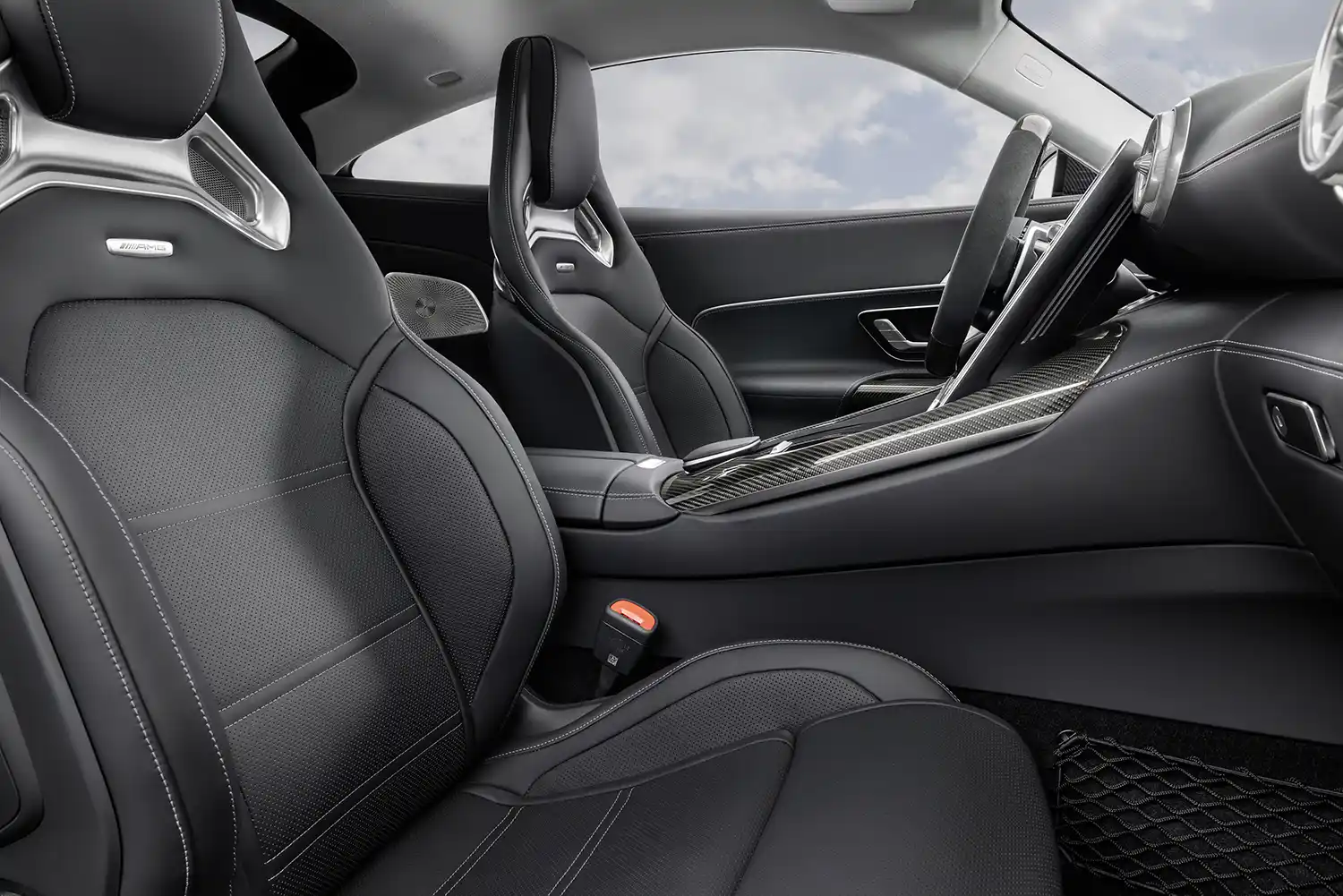 One of the many highlights in the interior is the sculptural seat design of the standard, electrically adjustable AMG sports seats with integrated headrests. Perfect ergonomics and progressive seam and stitching patterns complete the symbiosis of high-tech, performance and luxury. The large selection of different covers also reflects the range from comfortable to performance-oriented equipment. One‑tone and two‑tone Nappa leather are also among the options, as is particularly fine MANUFAKTUR Nappa leather upholstery with diamond quilting or the sporty combination of Nappa leather with MICROCUT microfibre and contrasting topstitching in yellow or red, alongside three massage programmes for excellent long-distance comfort. The ENERGIZING Package Plus combines, among other things, seat functions such as massage and different lighting moods to create stimulating or relaxing interior environments.