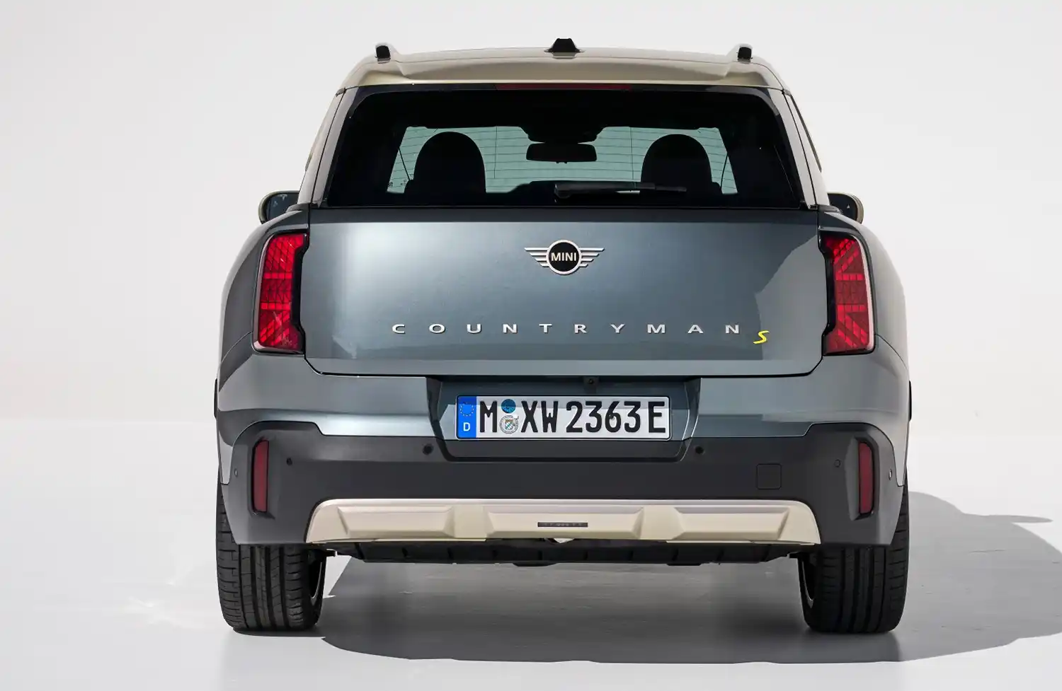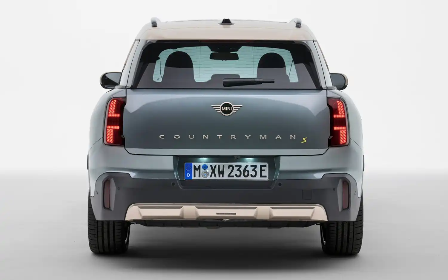 As a result of the new MINI aesthetic, the rear section has an especially consistent appearance with its clear surfaces and flush rear lights. Here, the vertical light cluster quotes the classic MINI lights and frames the large central section of the vehicle’s rear. This emphasises the wider stance of the new MINI Countryman while at the same time giving the body a particularly high-quality and upright appearance. As with the front headlights, the rear lights are also able to highlight certain vehicle characteristics by means of different modes. The pronounced shoulder section reinforces the powerful appearance of the new MINI Countryman. The rear tapers off below the model inscription, visually dividing the rear into two sections. The rear apron in the lower area emphasises the solid stance of the vehicle, while the generous surfaces in the upper area make the vehicle look lighter.