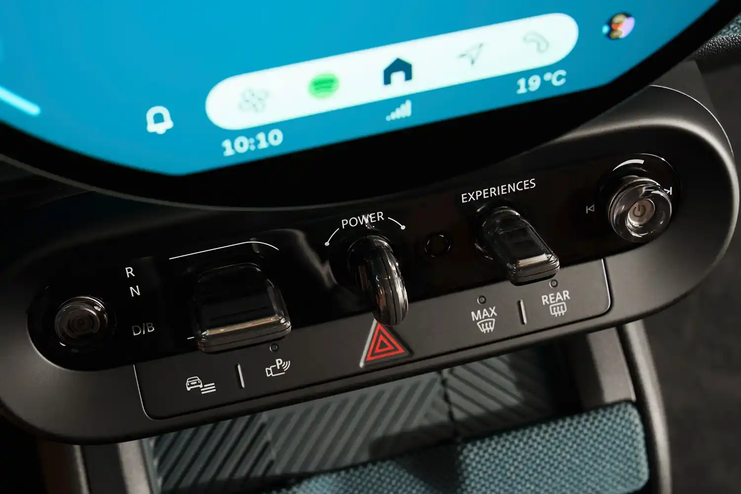 of the newly configured toggle bar quotes the various functions with five individually designed toggle switches. This makes the most important driving functions (parking brake, gear selector, start/stop key, experience mode toggle, volume control) directly accessible. At the same time it eliminates the gear selector in the center console generating space for practical and spacious storage options.