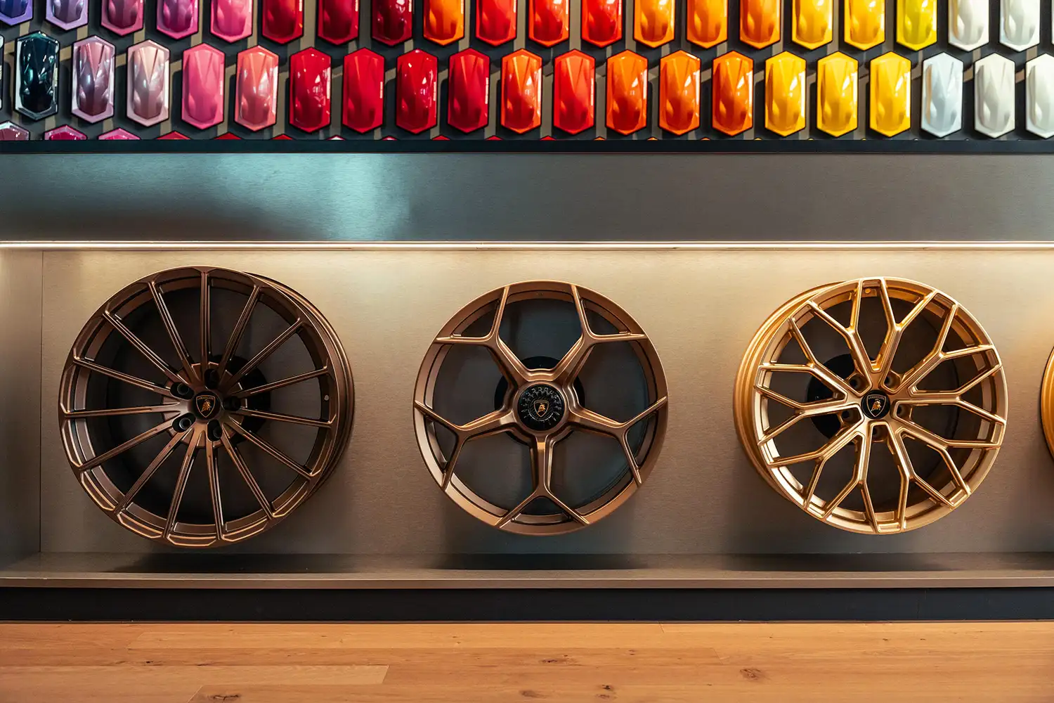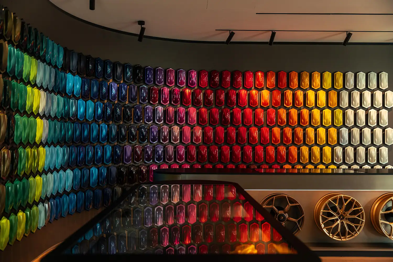 The new site offers the chance to display all the available options of the Lamborghini range for the first time in one place, according to growing levels of customization that go from more linear configurations defined through “Ad Personam essential”, represented by an expansion of the vehicle Color & Trim offering; to “One Shot” customization, based on specifications requested by the customer or on the use of exclusive or non-automotive materials. Moreover, the design of the Studio spaces and the layout of materials was devised by studying and recreating the optimal configuration process. Indeed, one of the key elements is the color choice and treatment of the vehicle’s external elements, which are the first sensory experience as soon as visitors cross the threshold to the Studio. A revolving platform is located at the center of the room to show off all the details of the vehicle while comfortably sitting in the lounge.