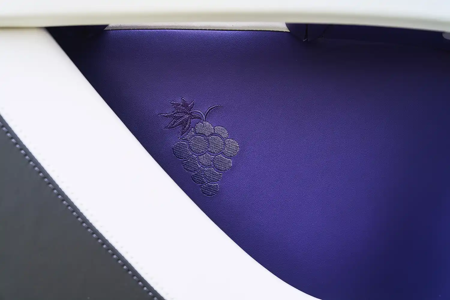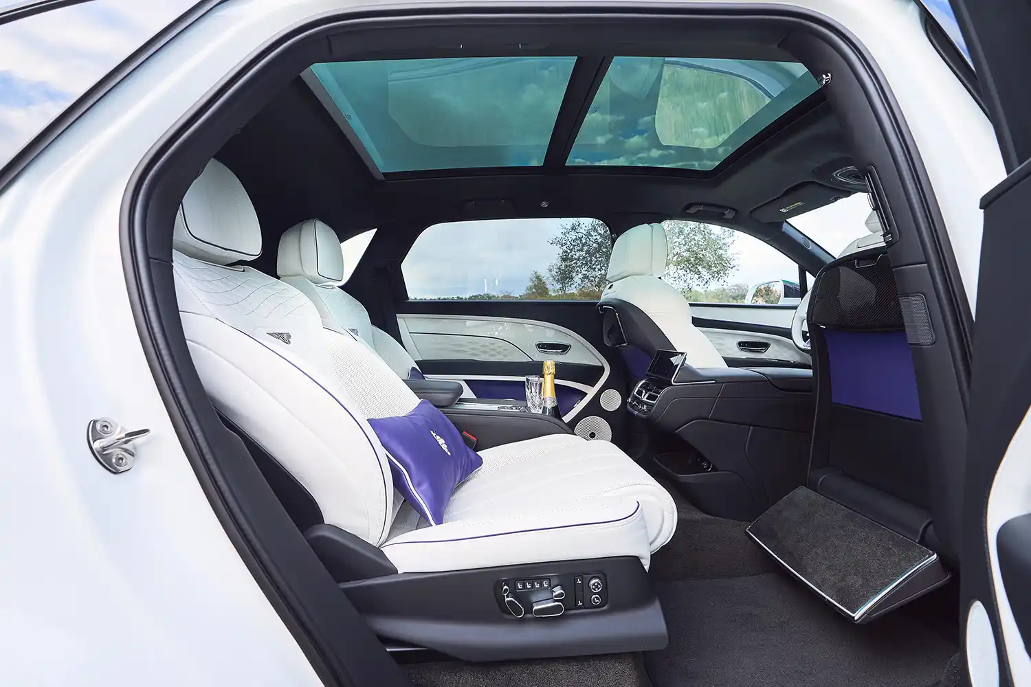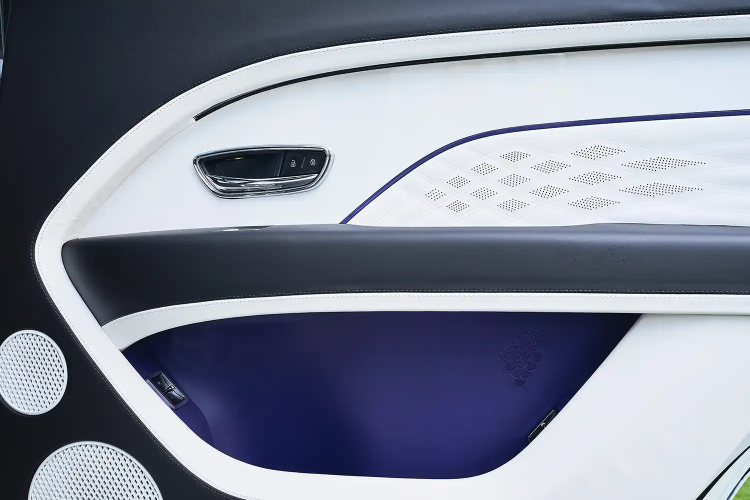 The Bentayga EWB features a three layer pearlescent Snow Quartz exterior paint. Contrasted with the Blackline Specification and finished with 22” ten spoke black painted and bright machined wheels. As a hidden delight feature, Amethyst detailing can be seen throughout the Mulliner White and Beluga Black cabin including the gear lever, door pockets, piping, and stitching. Mulliner’s additional loose rear cushions also take inspiration from the wine theme and are in Amethyst with white piping too.