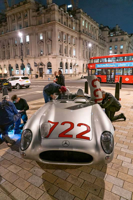 The result is a moving three-and-a-half minutes of film. The starting point of the drive, very early one Sunday morning, is The Temple. It then takes in the Houses of Parliament, Trafalgar Square, the Royal Automobile Club and the The Ritz hotel. On the way, “722” passes what was Sir Stirling’s very own 300 SL “Gullwing” – the car in which he travelled from London to the Mille Miglia in 1955. Its drive through the city ends in front of Moss’s own home in a Mayfair mews. There, his son, Elliot Moss, stands in front of the door and looks at the watch on his wrist, which his father wore for many years. It’s exactly 7:22 am, the original start time of Moss and Jenkinson’s Mille Miglia entry and the reason for the car’s racing number. The 300 SLR rolls to a halt one final time, and its engine is switched off.