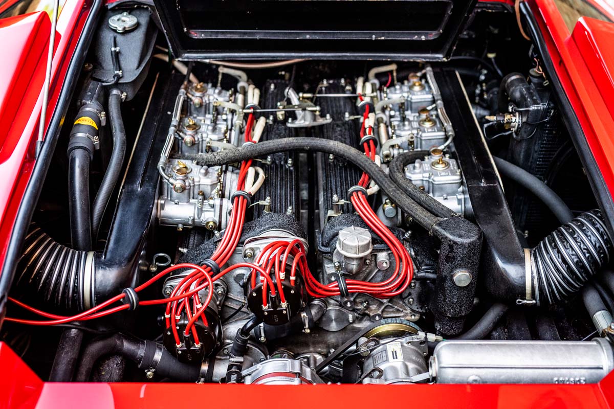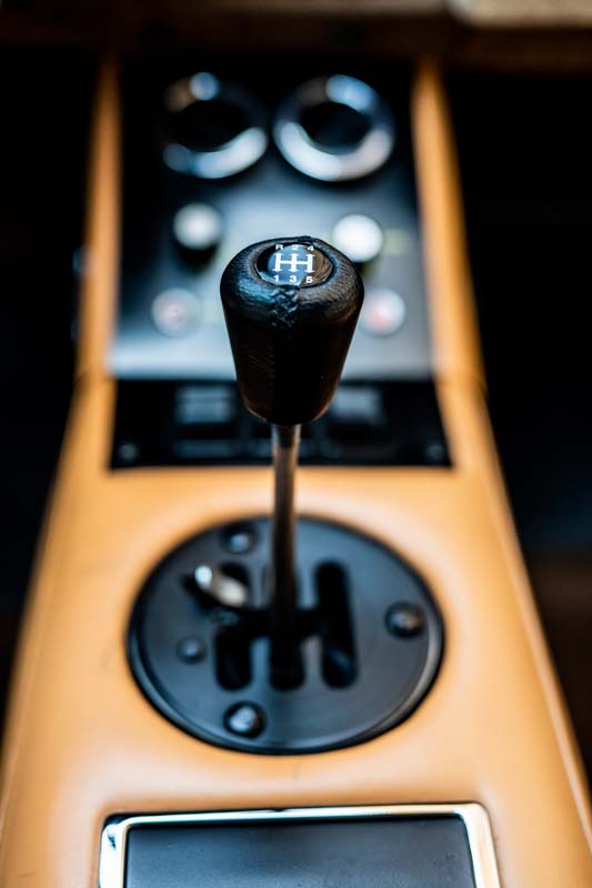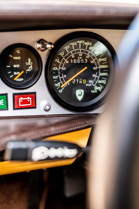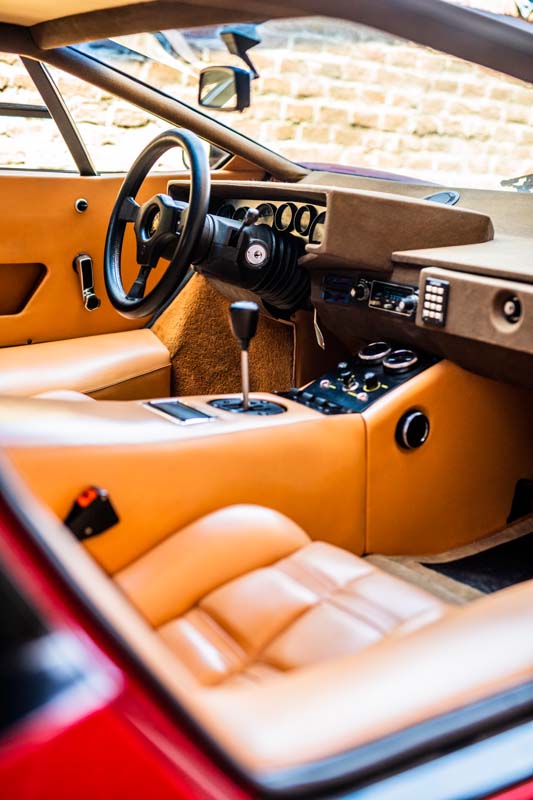 The 4-liter (3929 cc) engine, powered by six Weber 45 DCOE twin-body carburetors, developed 375 hp at 8000 rpm to reach a top speed close to 300 km/h. The suspension was derived from that of race cars, with triangles of different lengths, coil springs, hydraulic shock absorbers and stabilizer bar at the front axle and, at the rear axle, upper trapeziums and lower triangles, with adjustable double shock absorber for each wheel, and anti-roll bar. Its brakes were the disk type, self-ventilating and fitted with a new type of caliper designed for racing. Considered by many to be the purest version of Marcello Gandini’s design, the LP 400, with 152 series units produced up until 1977, is today the most sought-after version by collectors.