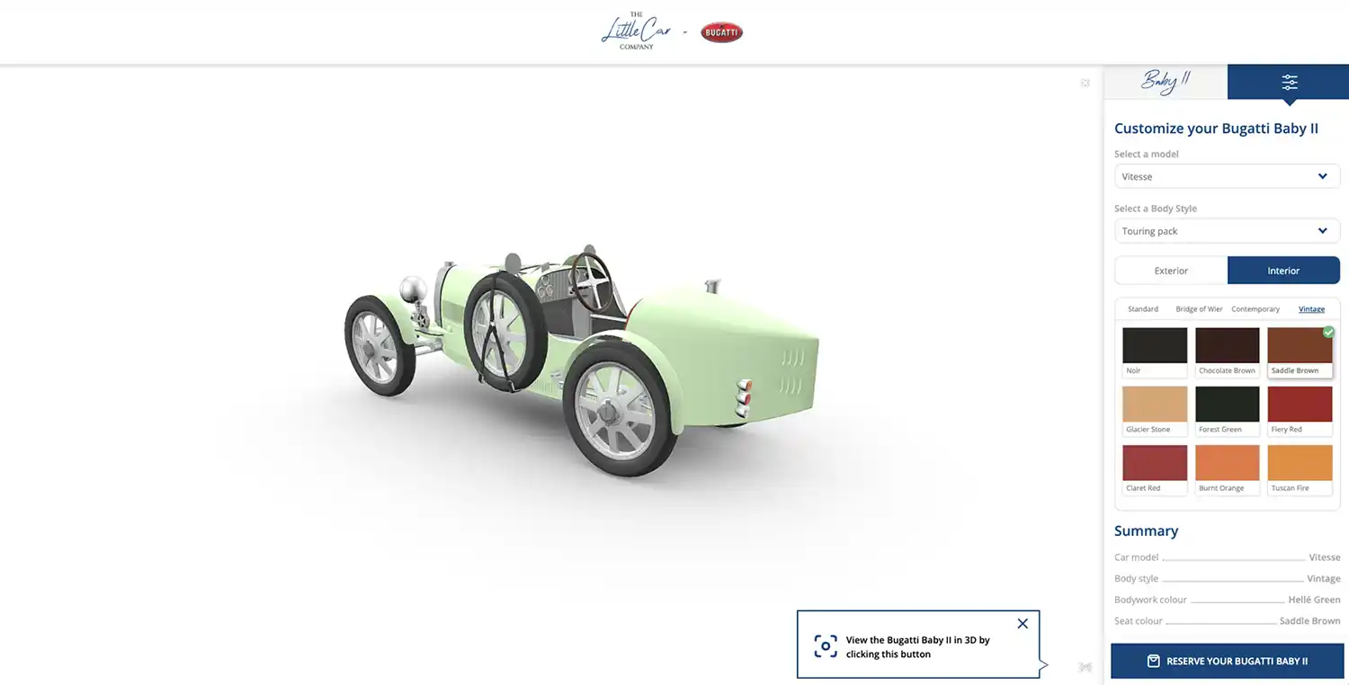 Encompassing the unique and personal style of the Bugatti Baby II, The Little Car Company has launched its all-new online Bugatti Baby II configurator. This cutting-edge configurator, developed in partnership with renowned software development agency, Ibisdev, gives customers the opportunity to design their very own specification, while viewing their creation in 3D augmented reality (AR). This innovative technology allows users to transport their Bugatti Baby II directly into their home, office or garage.