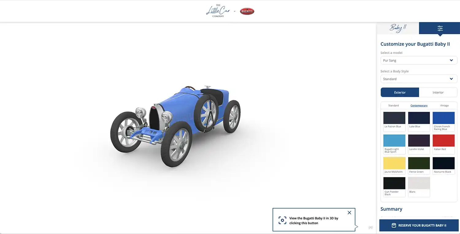 Ben Hedley, CEO of The Little Car Company, commented: “When you get behind the wheel of an iconic car, such as the Bugatti Baby II, it’s made all the much sweeter when you know your purchase has been personalised to your own specific, inimitable taste. And with the launch of our new configurator, the personalisation process that we offer our customers has been made even more immersive, detailed and bespoke.