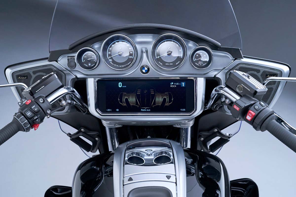 Front fairing with high wind shield, wind deflector and flaps. Cockpit with four analogue round instruments and 10.25 inch TFT colour display, additional headlamp, Marshall sound system, engine protection bars, cases, top case, seat heating, chrome trim and an engine in Silver metallic.