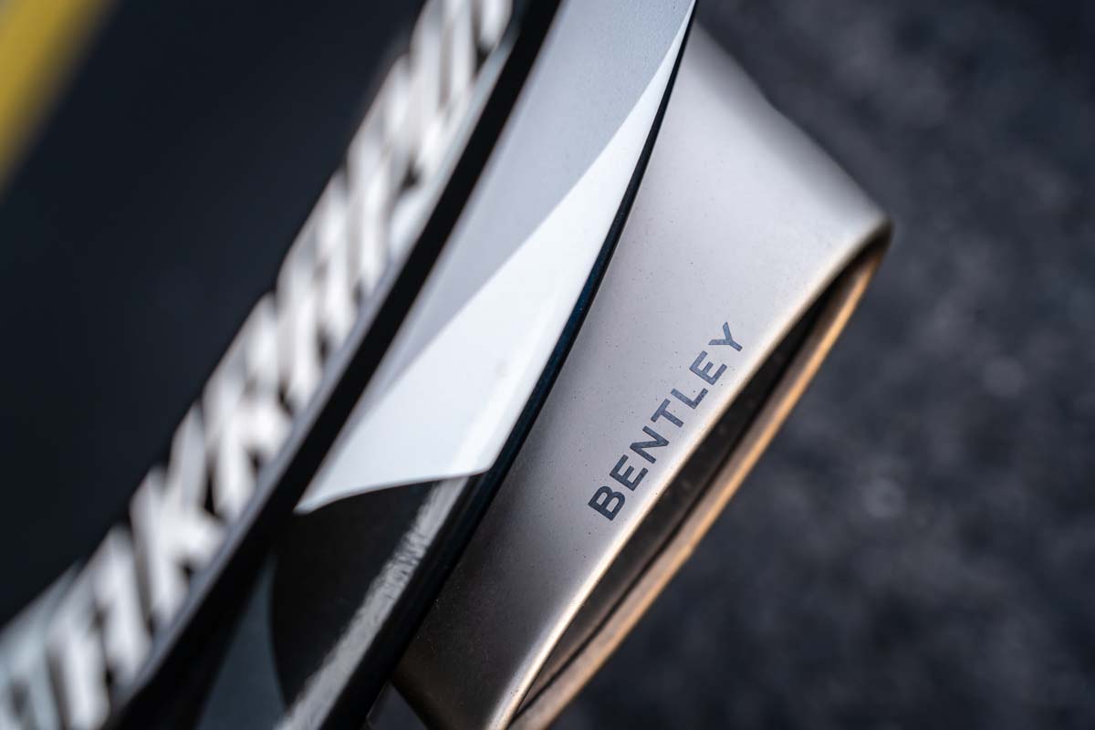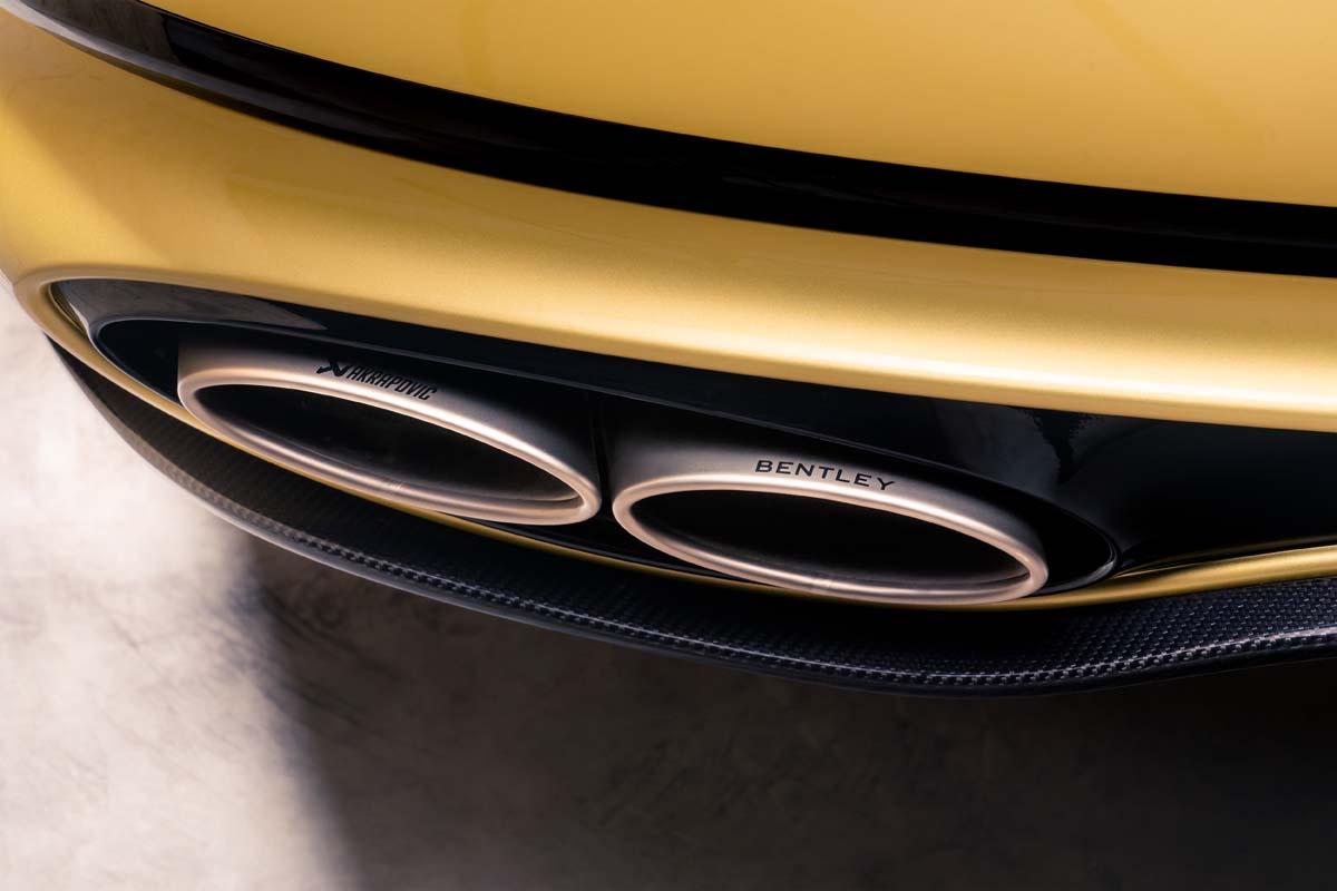 The sports exhaust is visually different from standard, with quad oval tailpipes with a matte titanium finish, and subtle Bentley and Akrapovič branding. The exterior is sandblasted and then coated to give a uniform surface finish; with increased durability and scratch resistance.