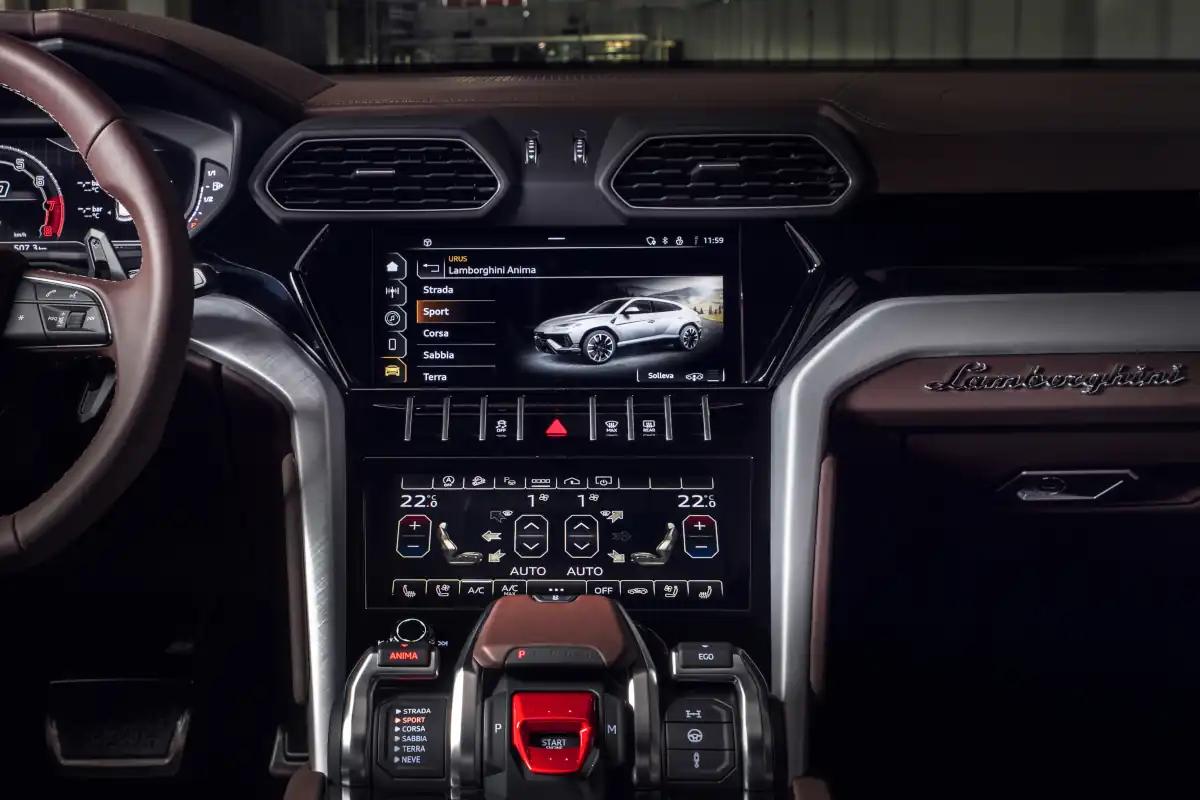 The Urus’ chassis with adaptive air suspension ensures super sports driving enjoyment but smooth handling on road surfaces in STRADA, SPORT, CORSA and EGO drive modes, with immediately-available torque response and body balancing according to the particular requirements of its off-road drive selectors: TERRA, NEVE and SABBIA. With the same powertrain calibration as the Urus Performante, the Urus S delivers optimum responsiveness and performance when required, alongside luxurious everyday driving pleasure from the Urus’ finely-tuned chassis settings. With formidable versatility in its driving personalities over any road in any condition, the Urus S is the ultimate lifestyle Super SUV.
