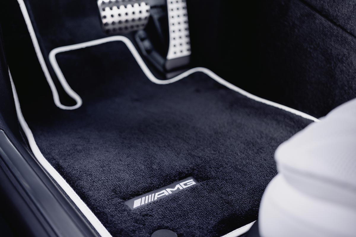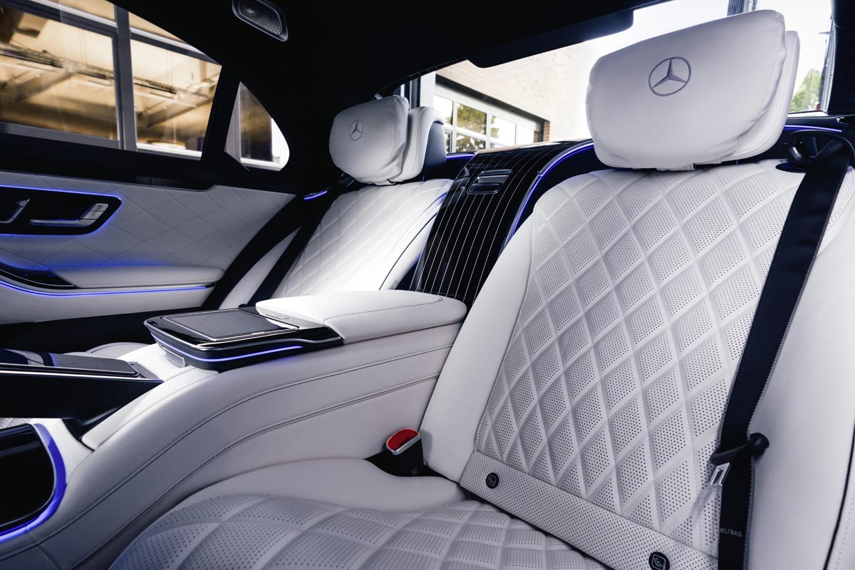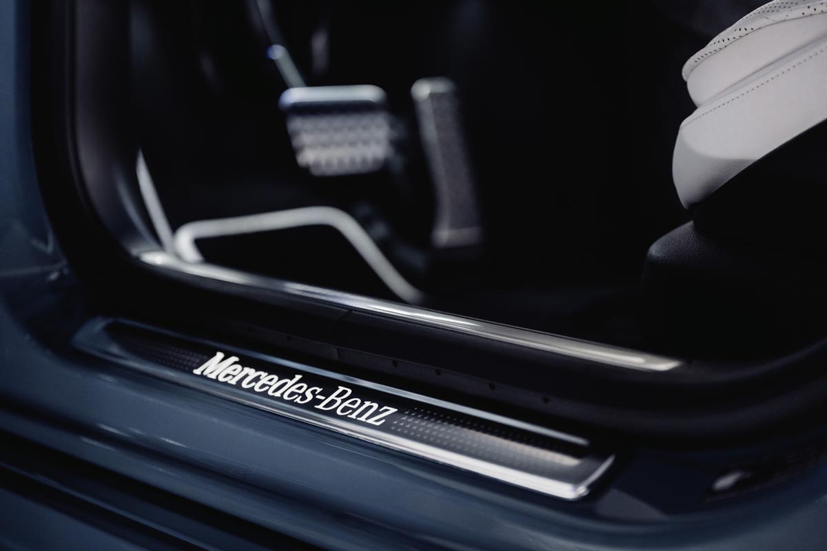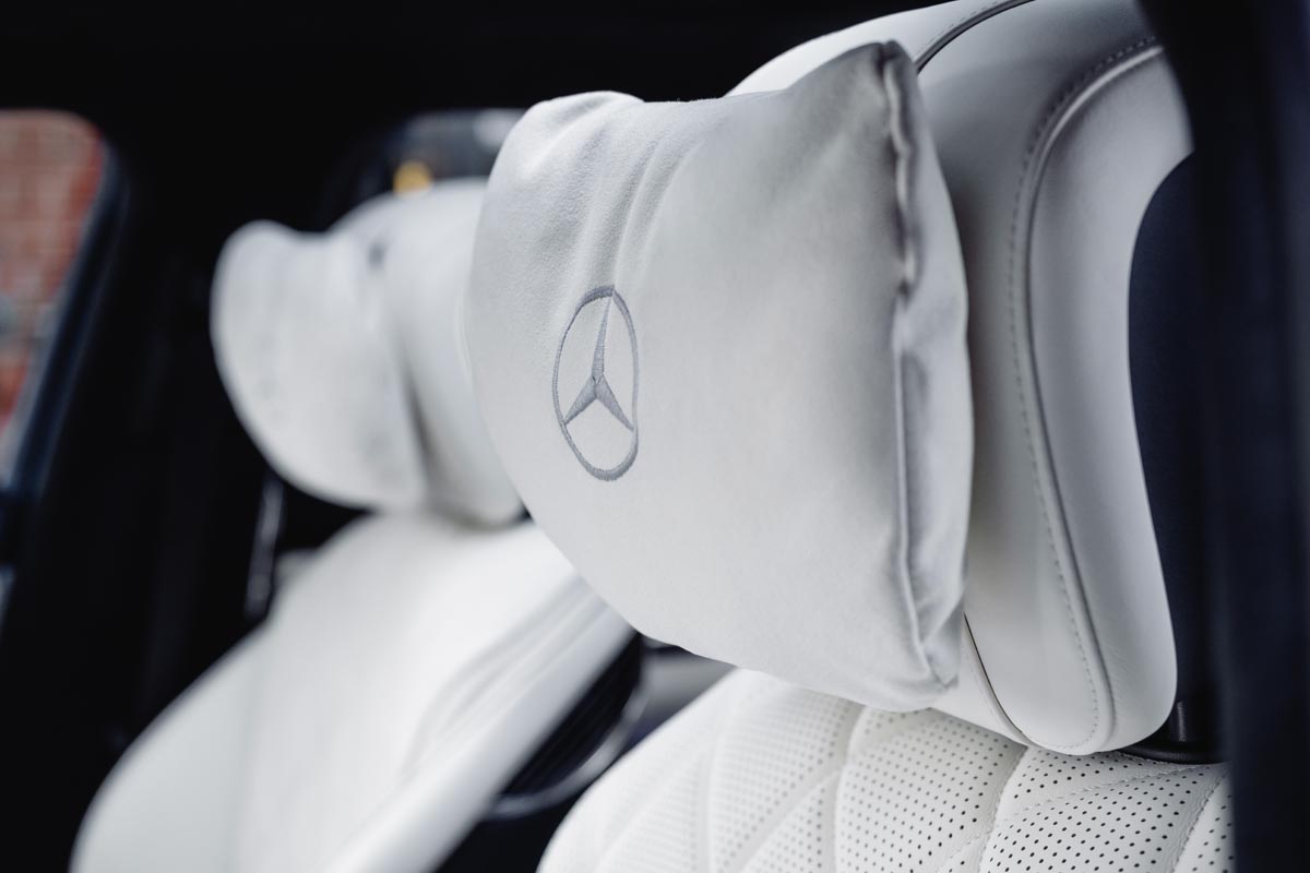 Another noble highlight that can be additionally selected is the MANUFAKTUR headliner made entirely of nappa leather with double-stitched Maybach rhombus. It consists of a rear central panel in a contrasting colour with diamond quilting and a middle central panel in a contrasting colour without diamond quilting. The harmonious interior is complemented by high-quality thick-pile floor mats edged with the chosen nappa leather in a contrasting colour. Depending on the line and the choice of Emblem package, they are embroidered with the Mercedes-Benz star, the Maybach logo or Mercedes-AMG lettering. The brand logos are also repeated on the door sill panels, where they are additionally illuminated and bordered by the current Mercedes Star pattern or, in the case of the Mercedes-Maybach, by the current Maybach pattern.