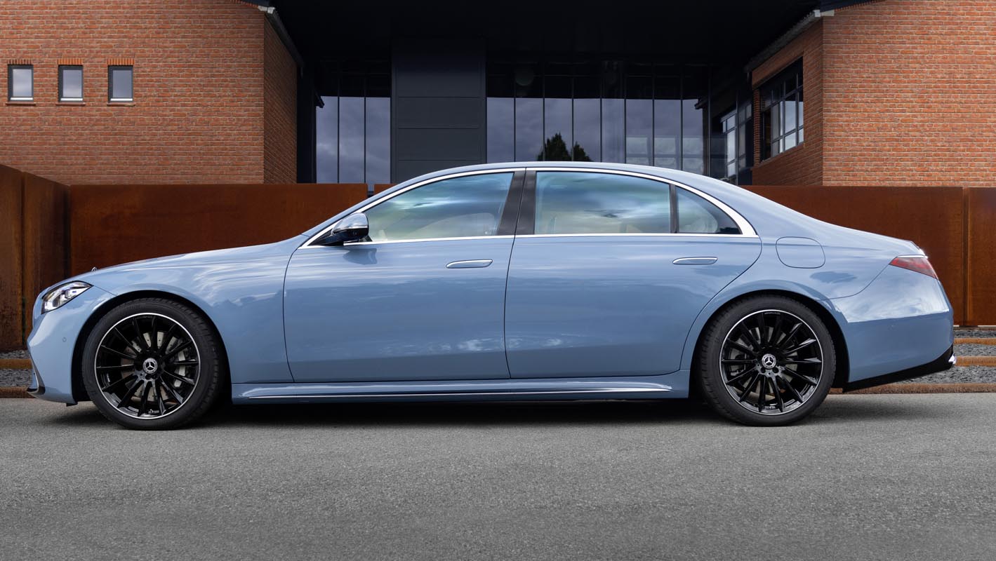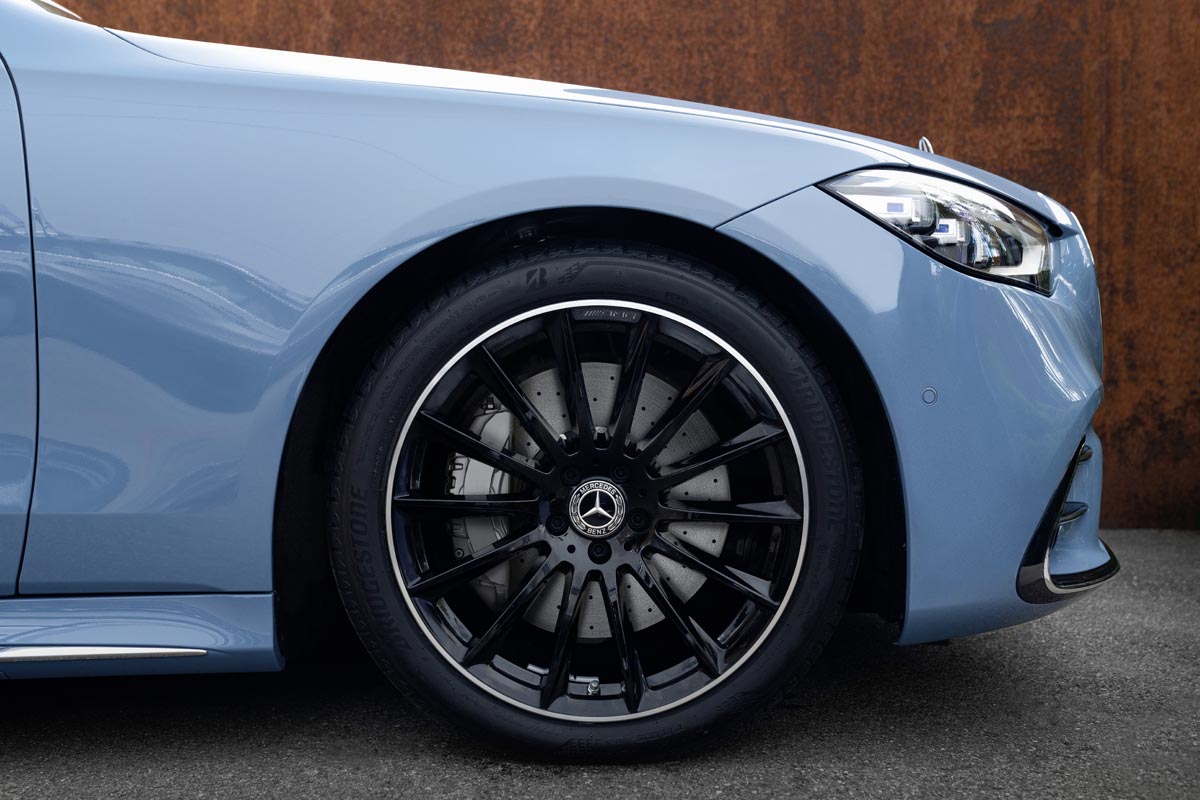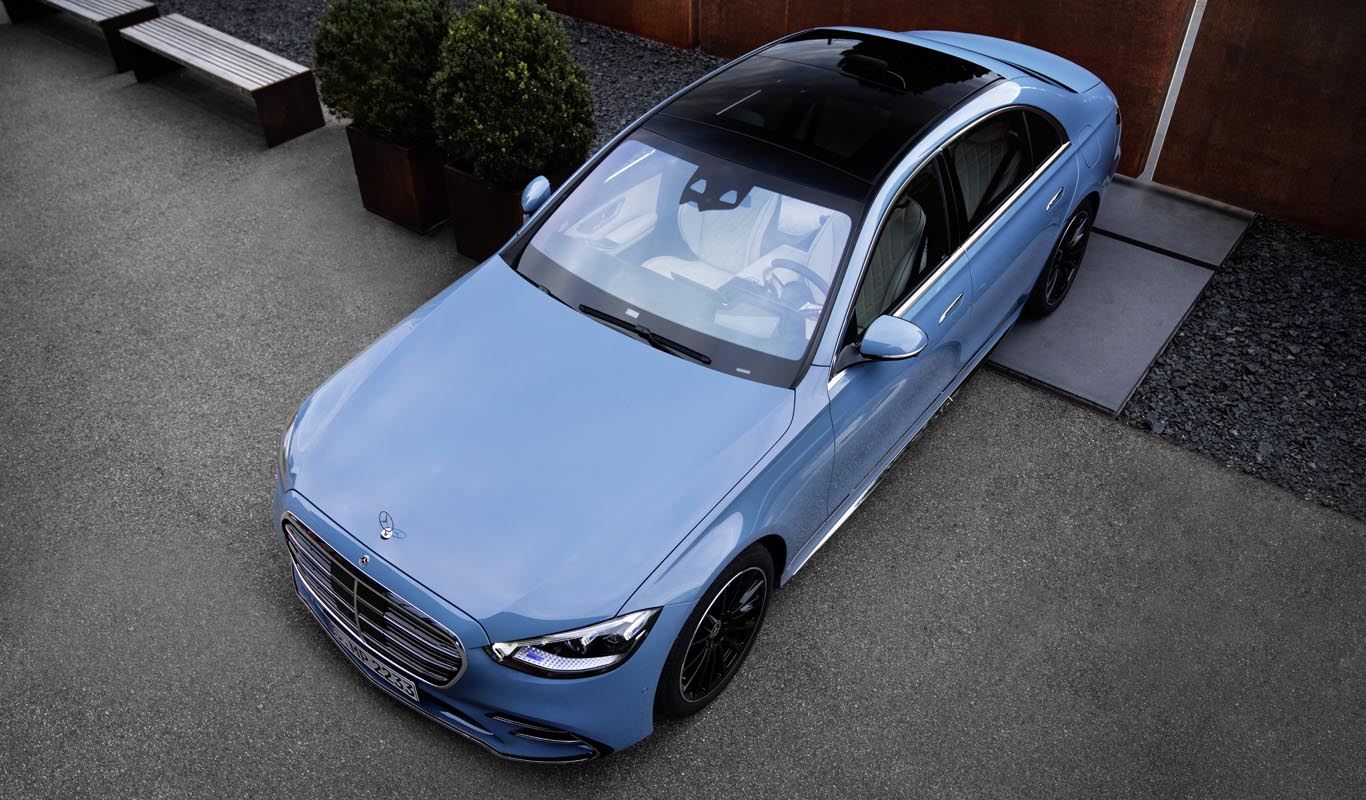 Another noble highlight that can be additionally selected is the MANUFAKTUR headliner made entirely of nappa leather with double-stitched Maybach rhombus. It consists of a rear central panel in a contrasting colour with diamond quilting and a middle central panel in a contrasting colour without diamond quilting. The harmonious interior is complemented by high-quality thick-pile floor mats edged with the chosen nappa leather in a contrasting colour. Depending on the line and the choice of Emblem package, they are embroidered with the Mercedes-Benz star, the Maybach logo or Mercedes-AMG lettering. The brand logos are also repeated on the door sill panels, where they are additionally illuminated and bordered by the current Mercedes Star pattern or, in the case of the Mercedes-Maybach, by the current Maybach pattern.