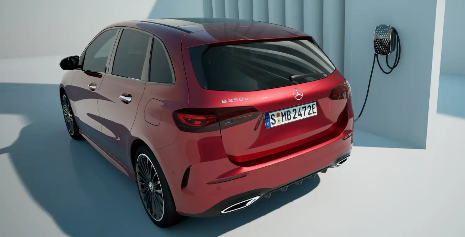 Plug-in hybrid with added power:The plug-in hybrids of the new B-Class (Mercedes-Benz B 250 e, fuel consumption combined, weighted (WLTP) 1.2-0.9 l/100 km, electricity consumption combined, weighted (WLTP) 17.4-15.4 kWh/100km, CO2 emissions combined, weighted (WLTP) 27-20g/km)[2]. benefit from a further improved high-voltage battery. The charging process has also been optimised: in addition to the 3.7 kW standard, the improved battery can now also be charged with alternating current and up to 11 kW, instead of only 7.4 kW as before. In addition, customers still have the option of charging the battery with direct current and up to 22 kW. A DC charge from 10% to 80% takes about 25 minutes – a simple and uncomplicated charging experience, especially in day-to-day life. The electric motor in the new B-Class has also been revised and achieves 80 kW of power after the update – an increase of 5 kW.