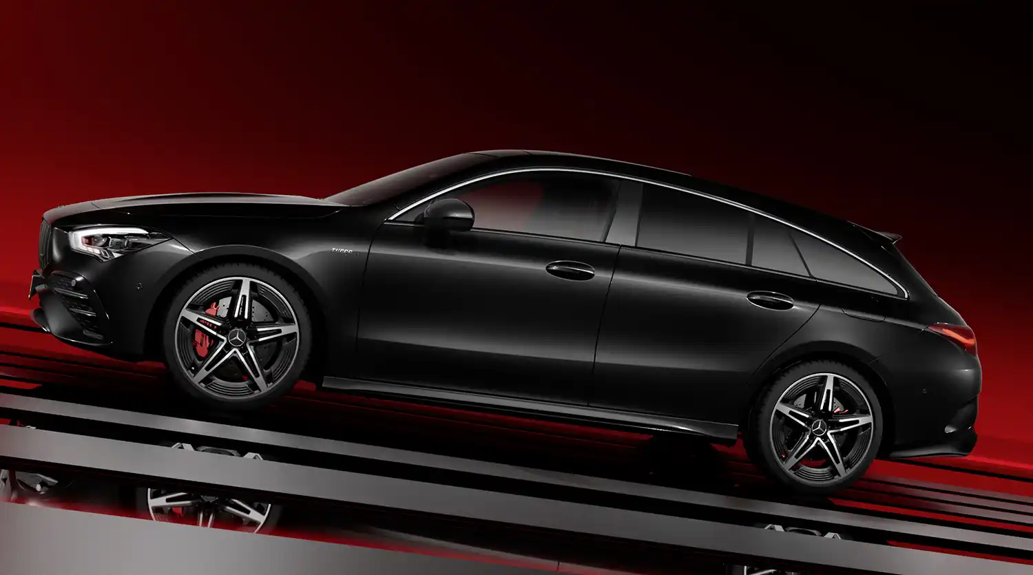A special limited edition is available for the CLA 45 S 4MATIC+ Coupé and Shooting Brake: the AMG Street Style Edition. With its MANUFAKTUR mountain grey magno paintwork and side foiling with the AMG logo and AMG pattern in the chequered-flag design, it emphasises the sporty appearance. The same applies to the colour accents in fluorescent orange. The edition rolls on 19-inch AMG light-alloy wheels in a five-twin-spoke design in matte black with a gloss-turned rim flange. Optionally, customers can order the Street Style Edition with 19-inch AMG forged wheels in a cross-spoke design, painted matte black and with a high-sheen turned rim flange. The red-painted brake callipers form an attractive contrast to both wheels. Other exterior elements include the AMG Aerodynamics package, the AMG Night package I and II and the AMG fuel-filler cap.