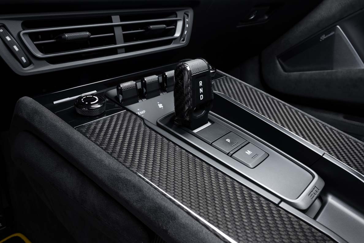 Striking lightweight fenders in conjunction with the wheel arch extensions – both components made of carbon – create an athletic appearance. Compared to the series vehicle, the newly designed wheel arch louvers provide additional ventilation for the brake system.