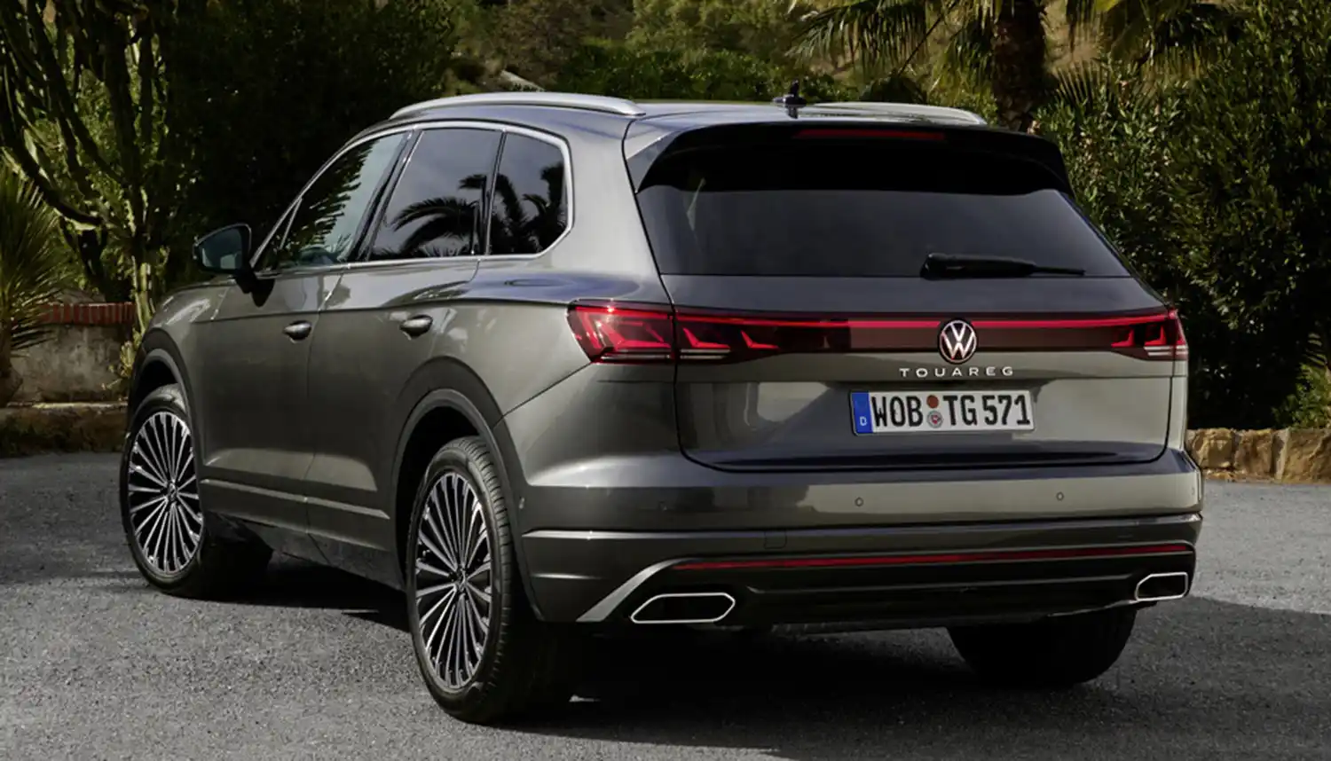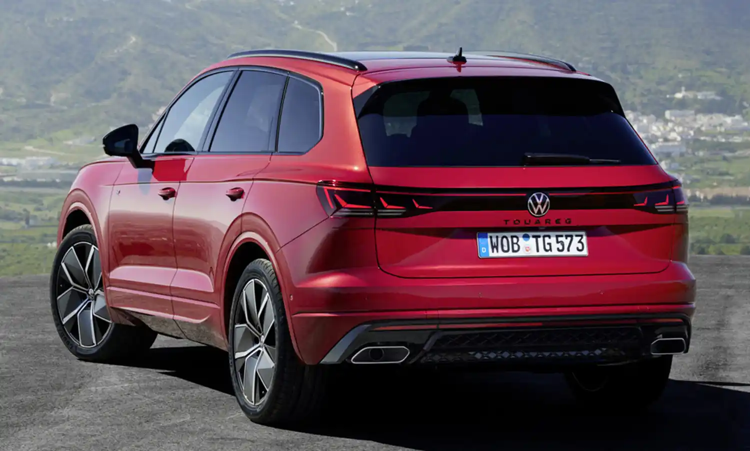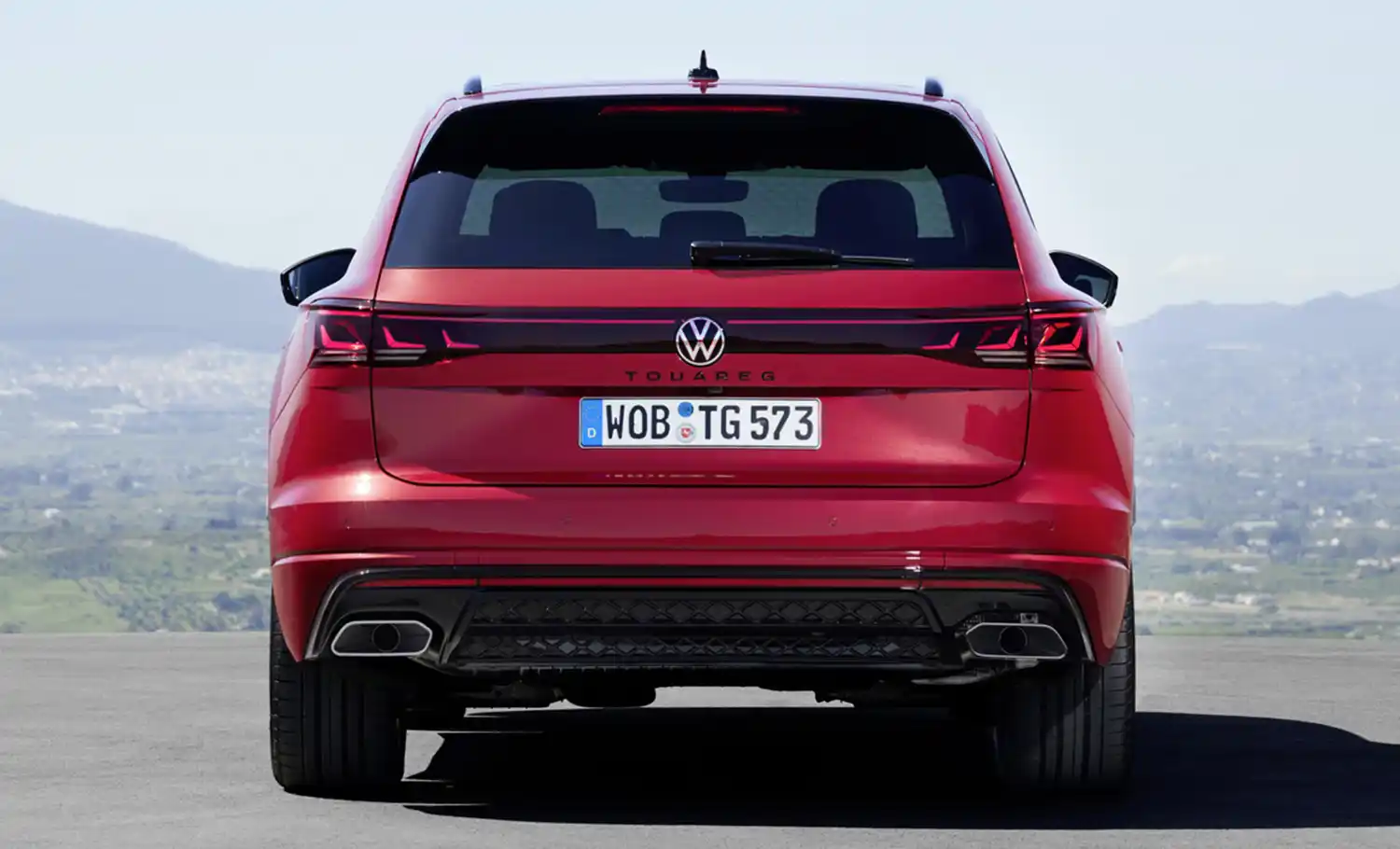 A light bar now extends across the tailgate of the Touareg. A thin horizontal LED line is illuminated in the upper area of the light strip when the lighting is active; this line has a contrasting light colour in daytime driving mode without the headlights switched on. The same applies to the total of six L-shaped LEDs in the new tail light clusters. As the first Volkswagen produced in Europe, the new Volkswagen Touareg has a red-illuminated Volkswagen logo in combination with the IQ.Light HD LED matrix headlights. This is integrated in the new horizontal LED strip of the tail light clusters. This produces a unique graphic both during the day and at night.