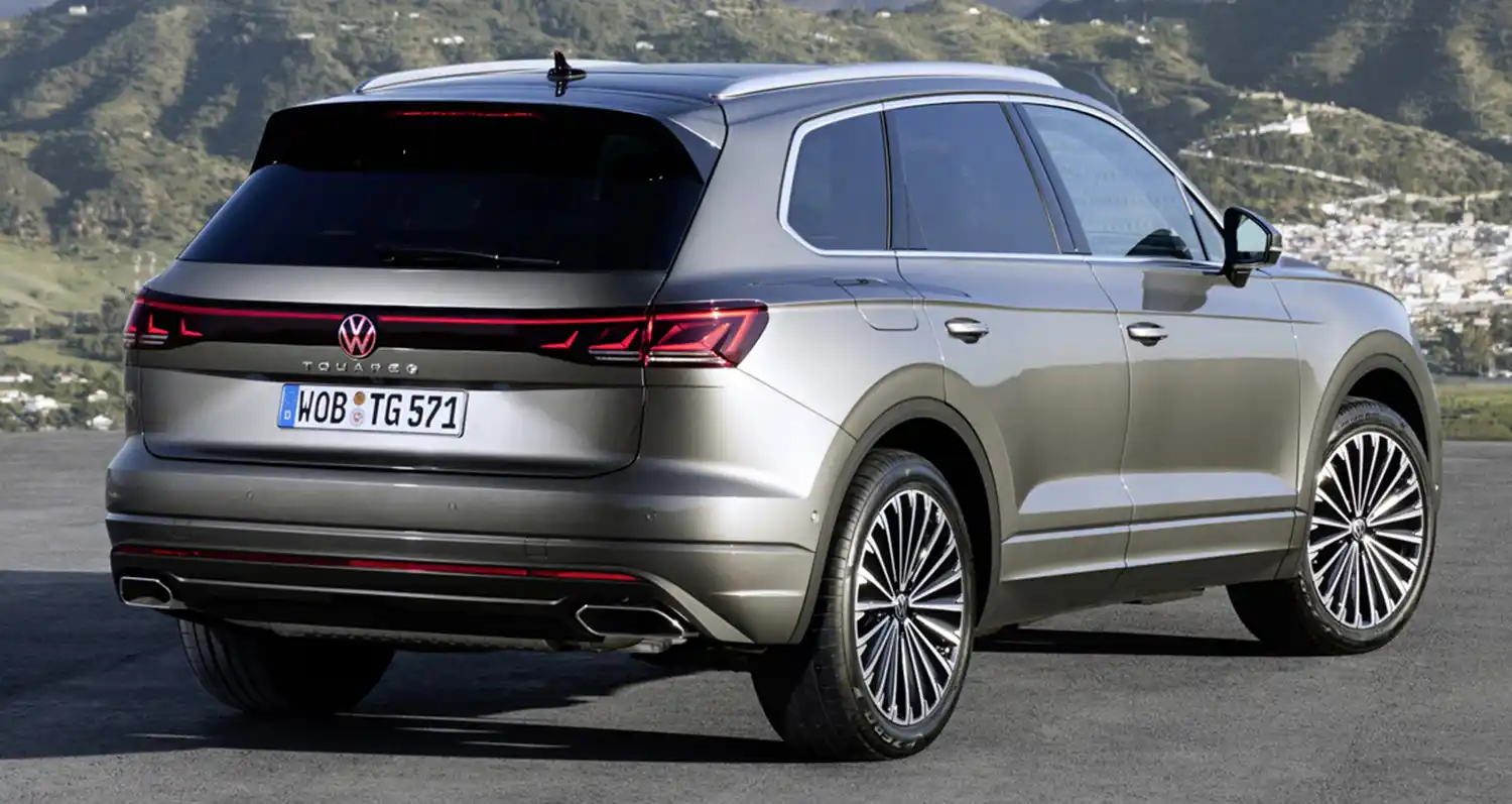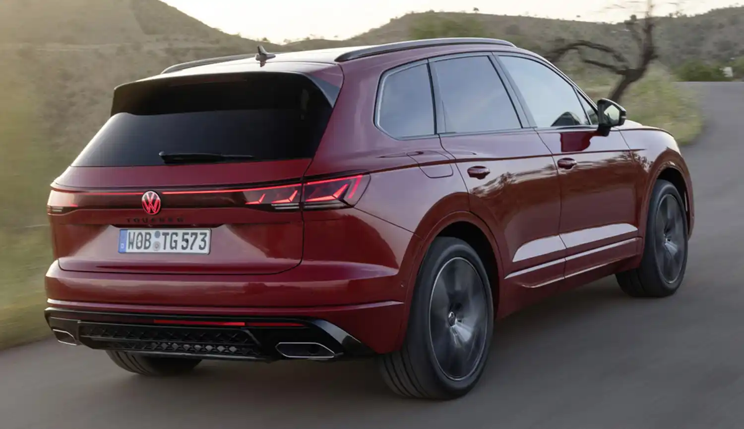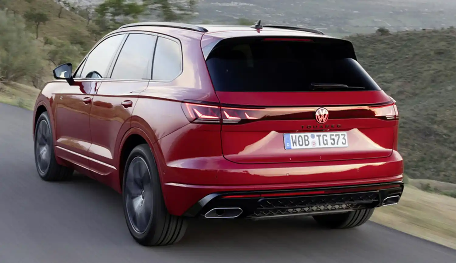 A light bar now extends across the tailgate of the Touareg. A thin horizontal LED line is illuminated in the upper area of the light strip when the lighting is active; this line has a contrasting light colour in daytime driving mode without the headlights switched on. The same applies to the total of six L-shaped LEDs in the new tail light clusters. As the first Volkswagen produced in Europe, the new Volkswagen Touareg has a red-illuminated Volkswagen logo in combination with the IQ.Light HD LED matrix headlights. This is integrated in the new horizontal LED strip of the tail light clusters. This produces a unique graphic both during the day and at night.