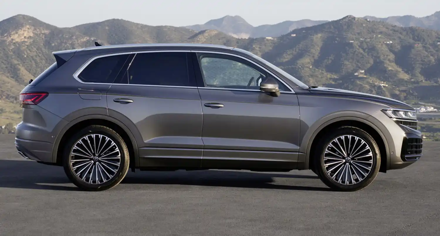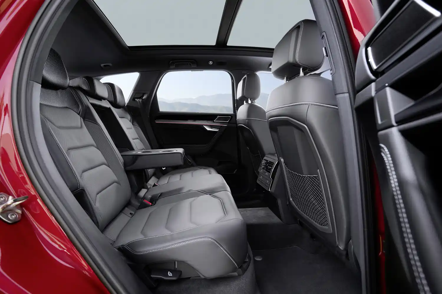 Depending on equipment, the new wheel rims in the designs Coventry (19-inch, standard for R-Line), Braga (20-inch, standard for R), Napoli (21-inch) and Leeds (21-inch) immediately catch the eye in the side view. As part of the surround lighting function, the Volkswagen logo or the R symbol (Touareg R eHybrid) are now projected on to the road from the exterior mirror housings when the VW Touareg is opened and parked in darkness.