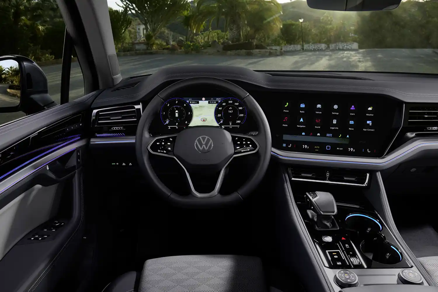 The VW Touareg is equipped as standard with the Innovision Cockpit – an intuitive combination of digital instruments (Digital Cockpit, display diagonal 30.5 cm, 1,920 x 720 pixels) and the Discover Pro Max high-end infotainment system with a central touchscreen (display diagonal 38.1 cm, 1,920 x 1,020 pixels). As a ‘one-screen design’, the two displays form a continuous digital landscape on one viewing and operating axis. Among other things, the Innovision Cockpit now offers lane-level navigation and high-resolution HD map data. The voice control system of the Touareg is also based on a new development level. App integration via smartphone and App Connect (Apple CarPlay, Android Auto) can now also take place wirelessly. Volkswagen has upgraded the buttons and the thumb wheel for volume control in the centre console – they are now finished in high-gloss black. In addition, Volkswagen has redesigned the illuminated trims in the dash panel and added the Touareg logo as a finishing touch.