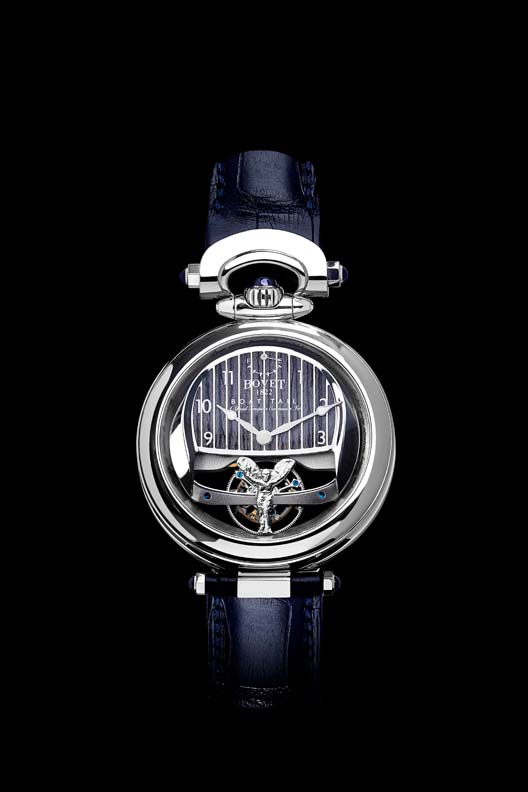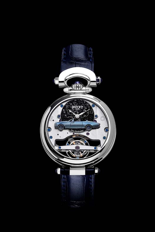 BOVET 1822 is a specialist in tourbillion timepieces, for which it holds a number of patents and has received many awards including the Aiguille d’Or, watchmaking’s highest honour. It is also one of the only companies in the watch industry to manufacture its own spirals and regulating organs. To reduce potential impact from the vibration from the car, the tourbillon has pivots rather than the traditional ball bearings; a heavier balance wheel and an increased oscillation rate to aid precision. Finally, the tourbillon bridge is finished with a miniaturised Spirit of Ecstasy handcrafted in gold.