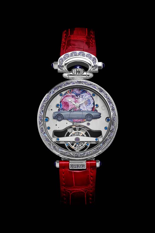 Women’s Reverse Dial: Miniature hand-painting of flower bouquet on mother-of-pearl dial (based on historical BOVET 1822 timepiece, customised); hand-engraved bespoke Boat Tail sculpture, lacquered to match the colour of the car then miniature painted by hand to add the details; gentleman’s name (engraved on the mirror-polished (by hand by the watchmaker) tourbillon bridge