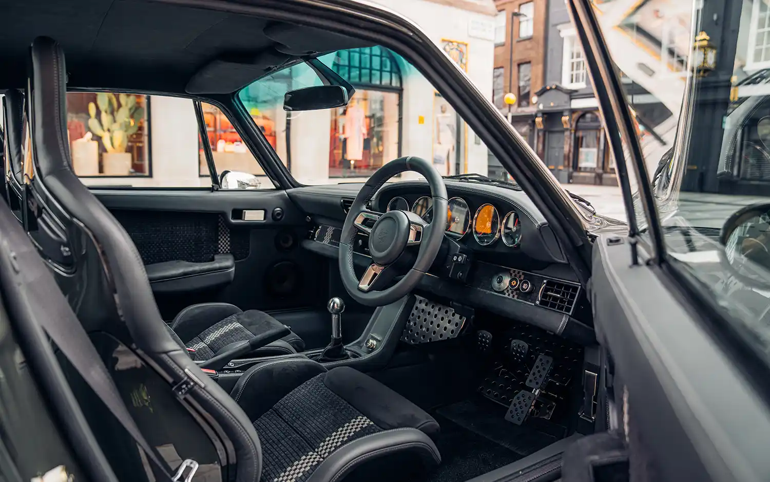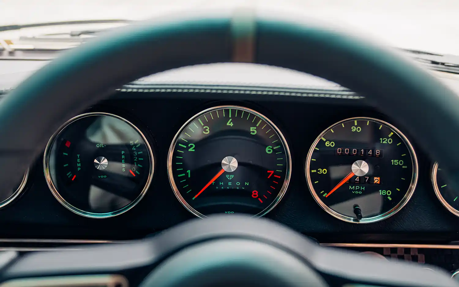 Also notable on GBR001 is Theon’s latest Aluminium Interior Pack – which carefully replicates the original ‘90s plastic Porsche items in beautifully cast metal – elevating the quality of switches, handles, vents, and more, to a new level. All touchpoints are given a warm satin finish to match the exterior highlights without distracting glare. The gauges – a key focal point – have tasteful chrome bezels, while a modern 911 sports steering wheel has been trimmed and painted to match the rest of the interior.