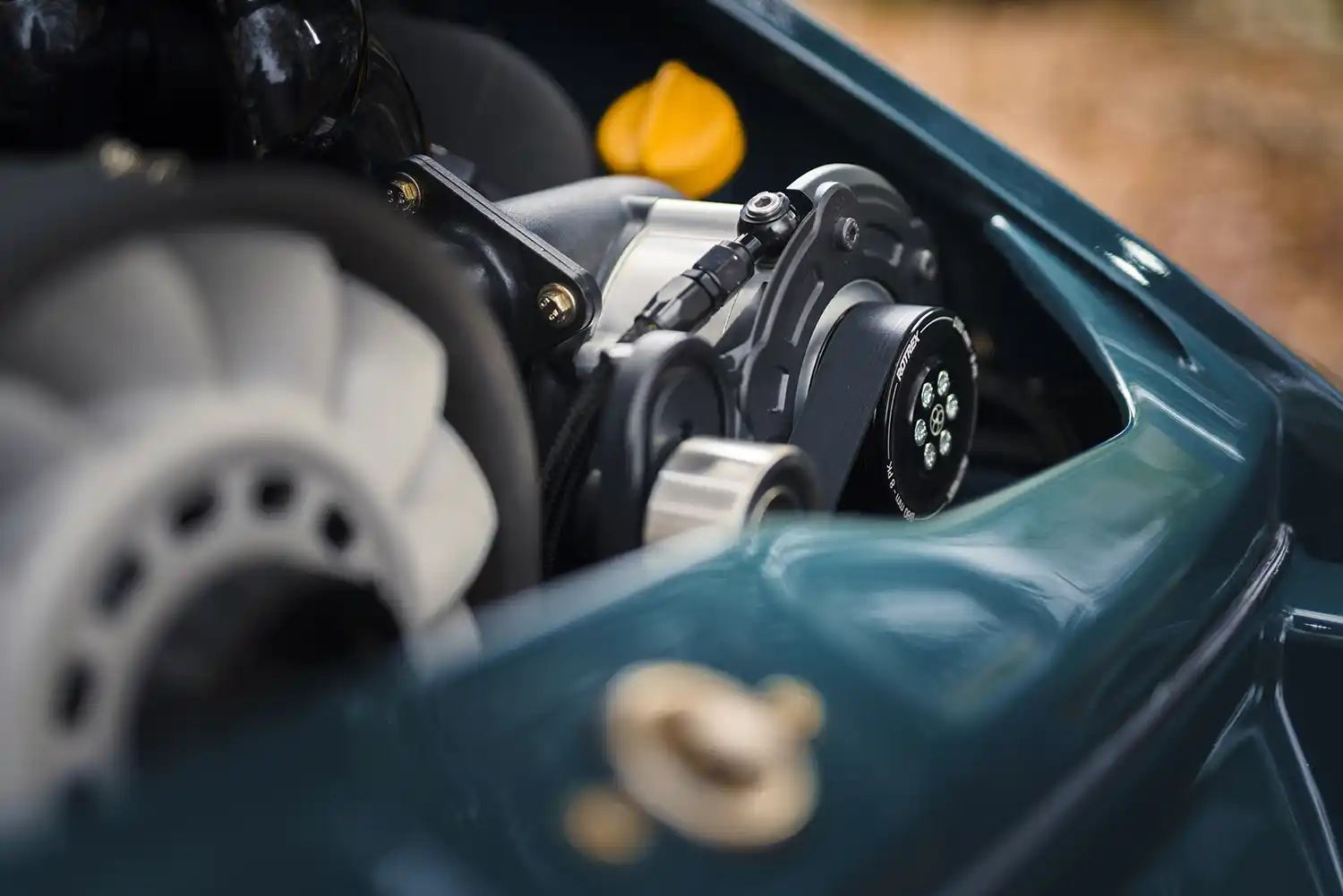 The first area of innovation lies in BEL001’s beautifully resolved engine bay: the supercharged air-cooled flat-six. The 3.6-litre unit has been built and expertly calibrated to ensure it meets, and indeed surpasses, the discerning customer’s exacting performance and driveability brief. While breaking new ground with the flat-six’s supercharged configuration, the team has gone to great lengths to ensure that the ‘Porsche’ feel of the motor is retained. Power builds in a linear fashion as the revs rise and the supercharger spins faster, pulling with ever increasing force, with a further kick in the upper reaches of the rev band.